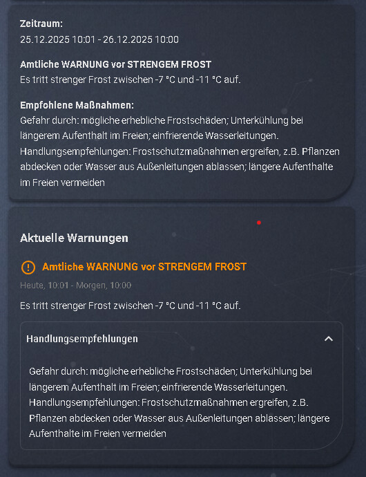 Heute gab es endlich mal eine Wetterwarnmeldung und ich kann die nina-dwd-card im Einsatz sehen. Anbei mal ein Bild, oben meine eigene markdown-Card und darunter die neue nina-dwd-card. Bis auf die Farbe finde ich meine Darstellung sogar etwas besser, aber ist halt auch Geschmacksache.