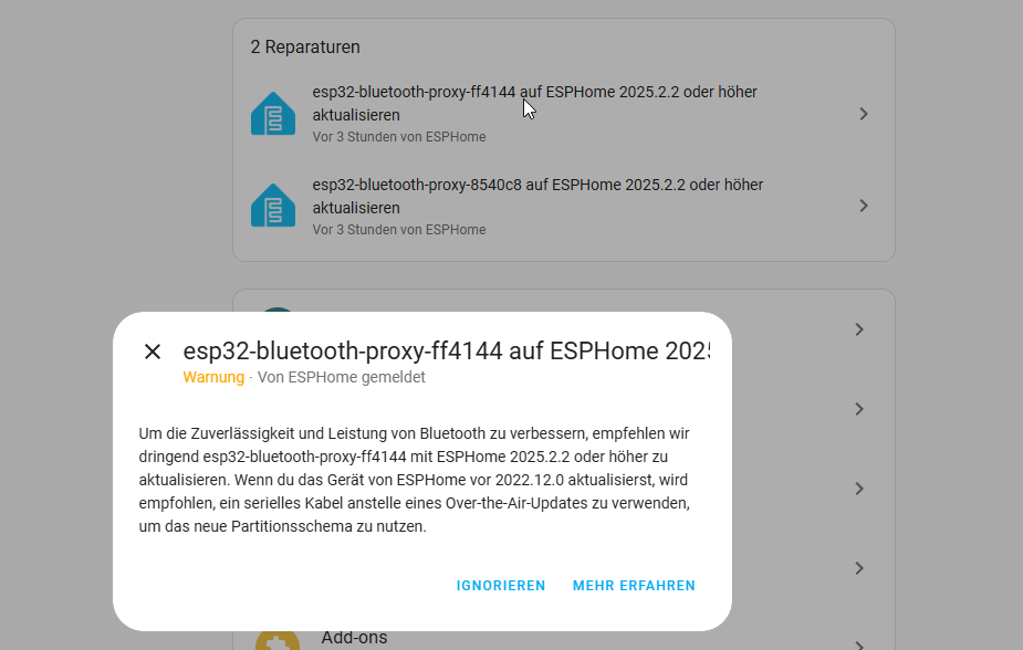 seit dem Update auf 2025.3.1, erhalte ich zwei Reparaturen für meine Bluetooth Proxies/ESPs.