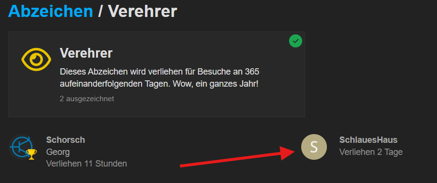 Das mit dem Abzeichen muss ein Bug sein, hängt sicherlich mit den Forum Problemen zusammen. Bei Schorsch dürfte heute eigentlich kein Kuchenstück mehr zu sehen sein, weil man das gestern schon gesehen hatte, so wie bei mir. Da stimmt also auch etwas nicht im Hintergrund.