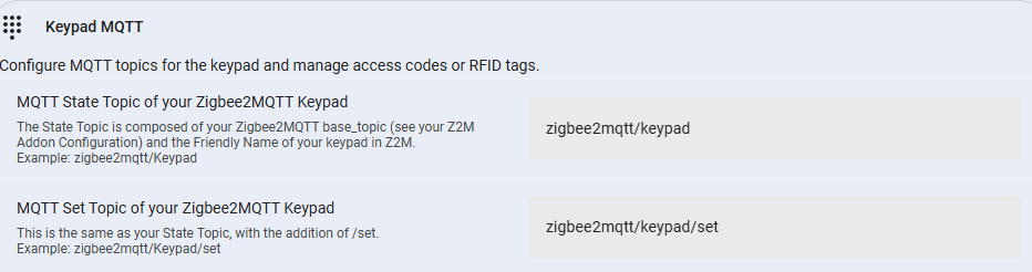 A list of valid PIN codes and RFID tags that can be accepted by your keypad, separated by semicolons " ; ".