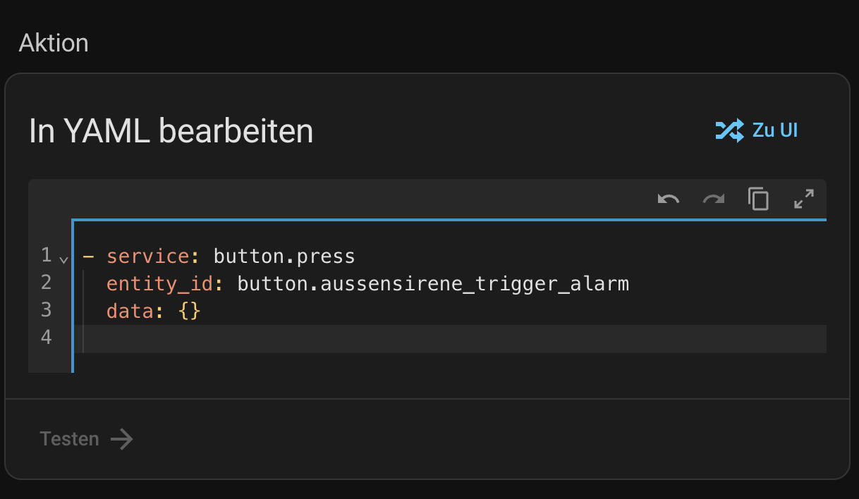Hallo, ich habe die neuste HA Version installiert und möchte nun mit Alarmo eine Alarmanlage bauen. Habe dafür die Bosch Aussensirene über Zigebee angebunden (klappt auch). Nur leider bekomme ich die Sirene nicht unter „Alarmo - Aktionen“ hinzugefügt. Ich möchte natürlich bei einem Alaram die Sirene einschalten lassen.