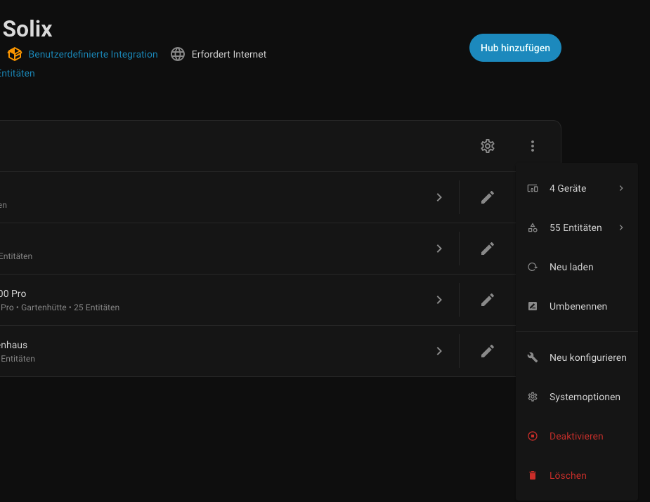 Nene. du gehst über Geräte und Dienste - dann direkt die Integration Anker Solix anklicken ( nicht die Anzahl der Geräte). Dann auf das Menü die 3 Punkte bei dem ersten Eintrag.