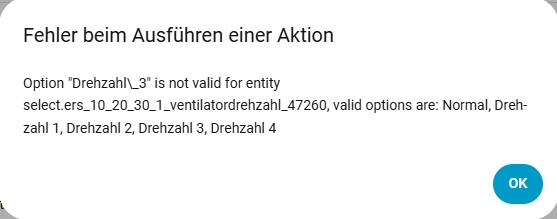 Mit einer Automation möchte ich die Drehzahl abhängig von der Temperatur einstellen. In der Automation möchte ich die Aktion „Auswahl“ verwenden. Das funktioniert auch, wenn ich Auswahl „Normal“ einstelle. Bei den anderen Drehzahlen funktioniert die Auswahl leider nicht. Wähle ich Drehzahl 1, 2, 3 oder 4, dann erscheint eine Fehlermeldung, dass die Auswahl Drehzahl 1 lauten muss (was ja aber der Fall ist :-). Das funktioniert weder über die Bezeichnung in der Fehlermeldung (Drehzahl 3) noch über die Bezeichnung laut Entwicklerwerkzeuge/Zustand („Drehzahl_3“).