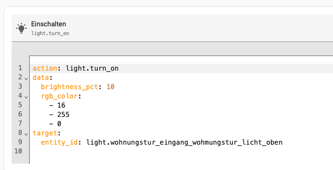 Irgendwie mache ich immer noch was falsch. Ich habe in den Entwicklerwerkzeugen unter Aktionen die Aktion Leuchte: Einschalten gefunden, die entity meines Schalters eingetragen, eine Farbe und eine Helligkeit gewählt und das alles ausgeführt.