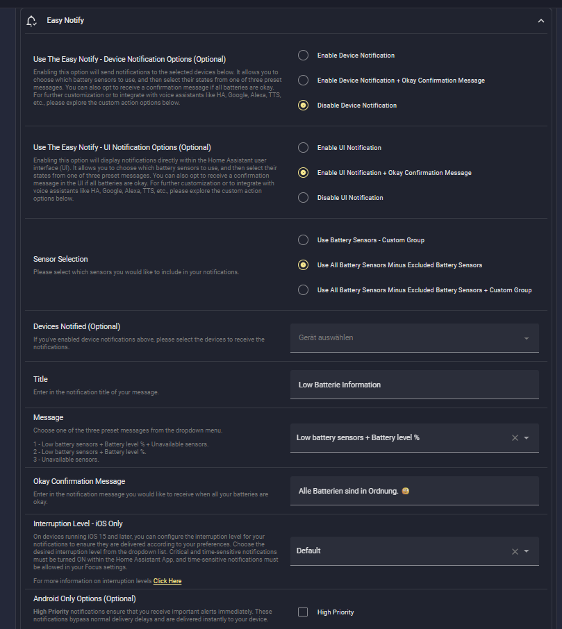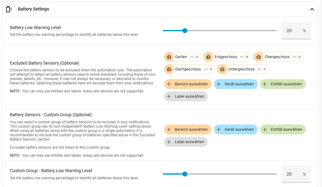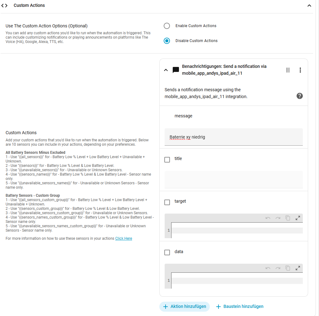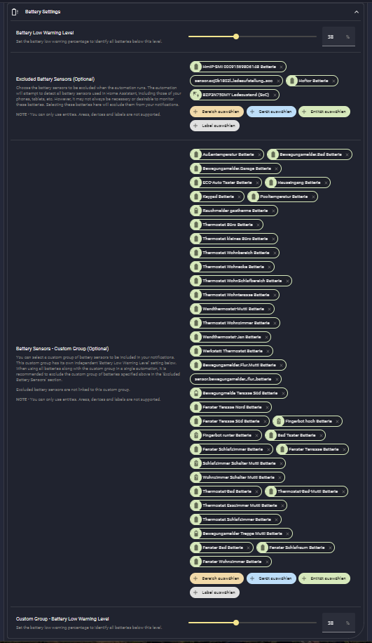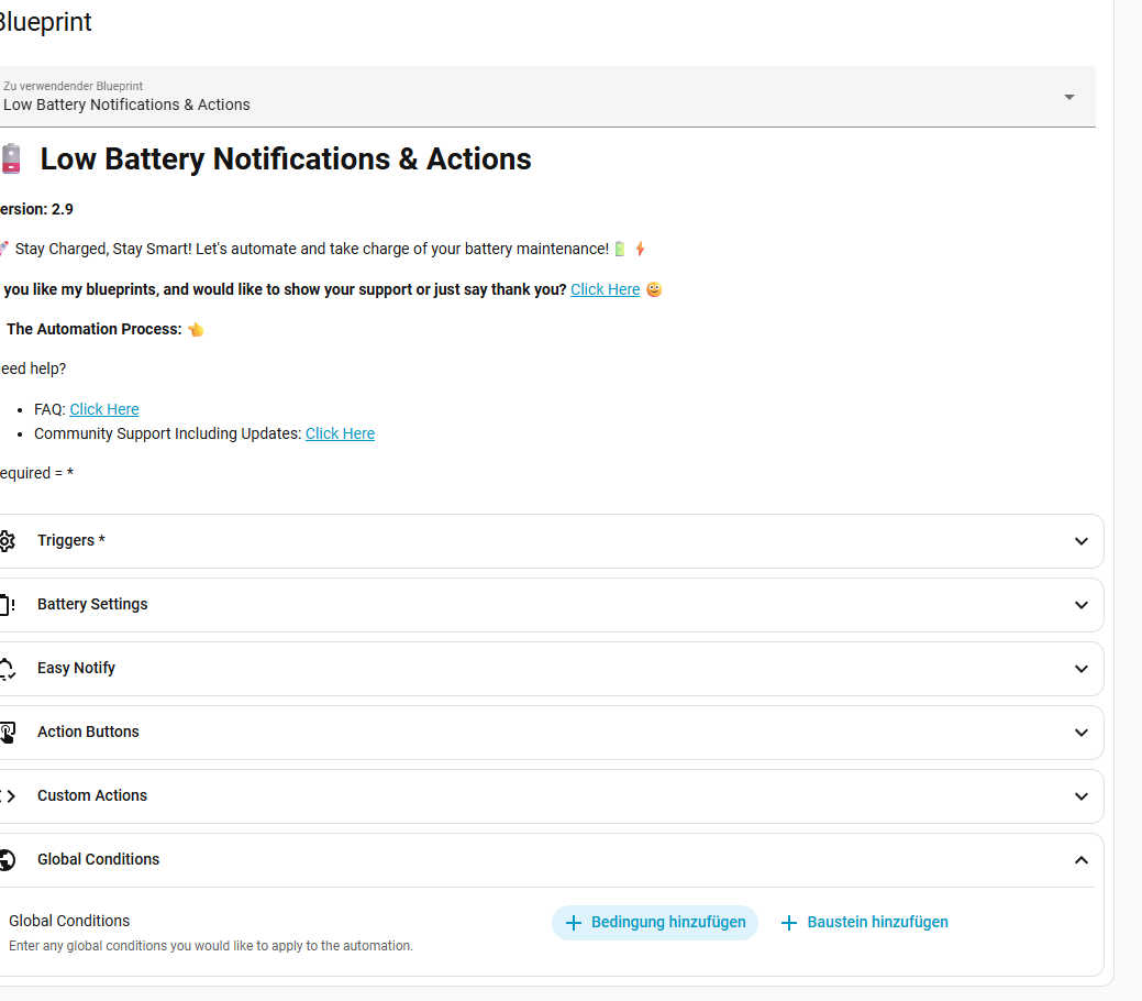 Das ist das Blueprint wo ich nutzen möchte um Batteriestände an zu zeigen. Hab bisher noch kein Blueprint eingerichtet, deswegen tue ich mir da auch ein wenig schwer. Speichere ich da Teil kommt „Response Error 500“ - was übrigens auch bei allen Versuchen kommt Automationen ein zu richten.