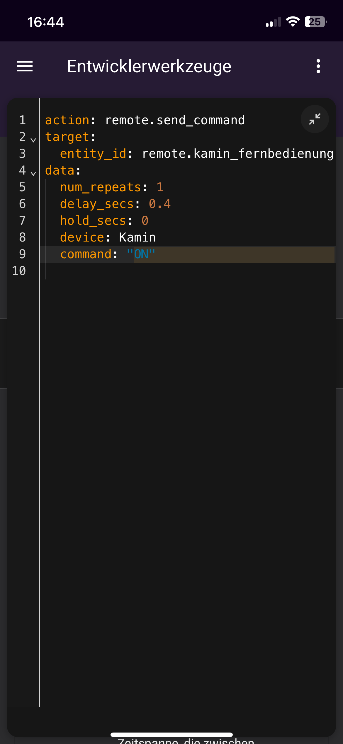 Ich habe vor kurzem mein Elektrokamin Fernbedienung mit Broadlink RM4 Mini smart gemacht. Ich habe das YouTube Video von Tobias Lerch angeschaut und hat auch wunderbar funktioniert. In den Entwicklerwerkzeug unter Aktion kann ich das Befehl senden und der Kamin geht an.