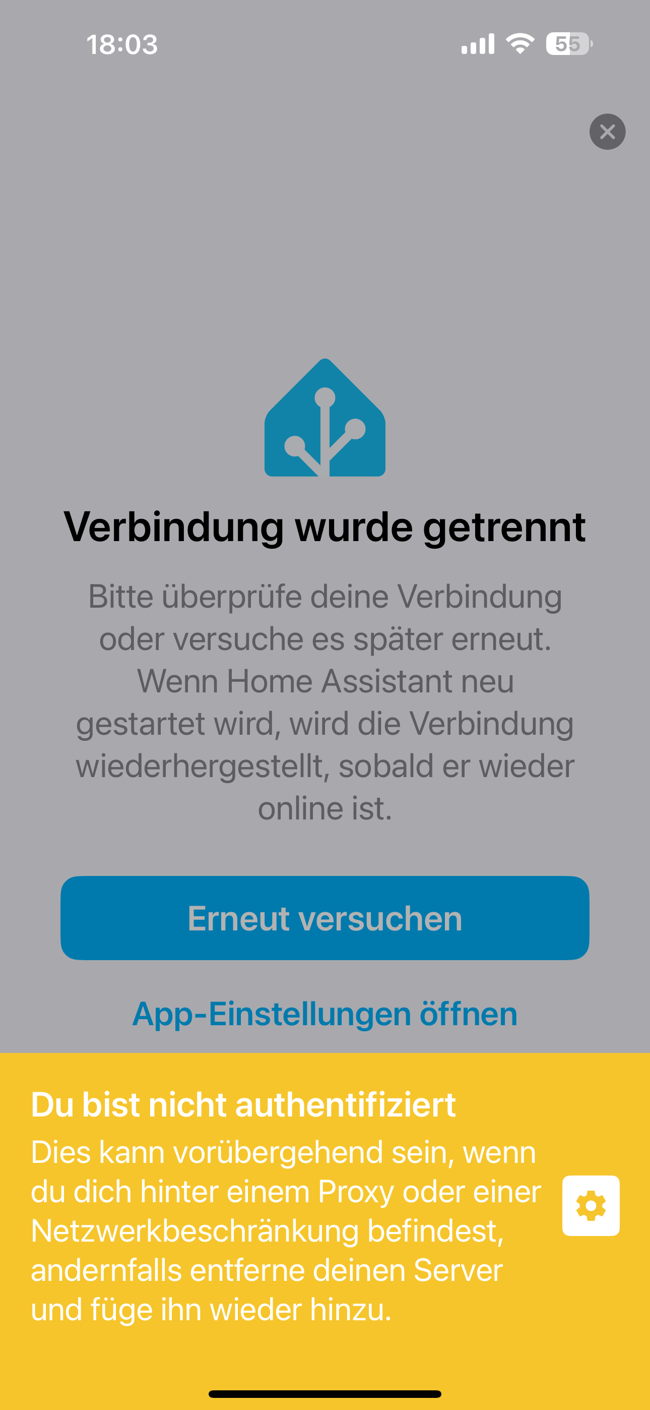 hallo, bin noch ziemlicher neuling bei home assistant und bekomme nun überhaupt nicht die companion bzw. ha app zum laufen. es kommt immer der folgende fehler: „unable to connect to home assistant. retrying in 57 seconds…“ aber dann passiert nie was. (danke für eure hilfe.
