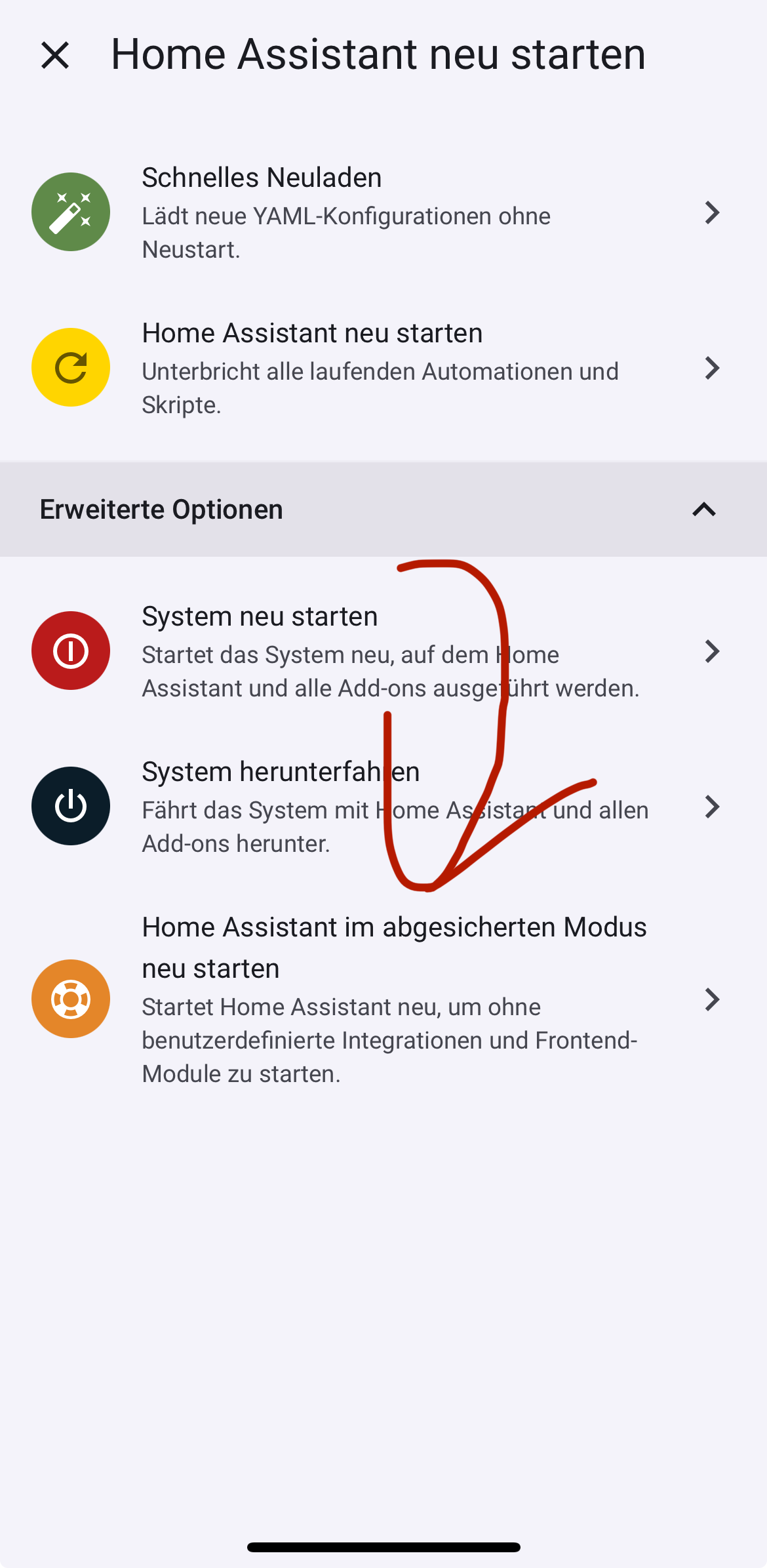 Ansonsten starte HA mal im abgesicherten Modus (unter Ausschalten → Erweiterte Optionen) und schaue dann ob die App richtig läuft, damit kann ausgeschlossen sein, dass eine Integration oder Ähnliches den Fehler auslöst.