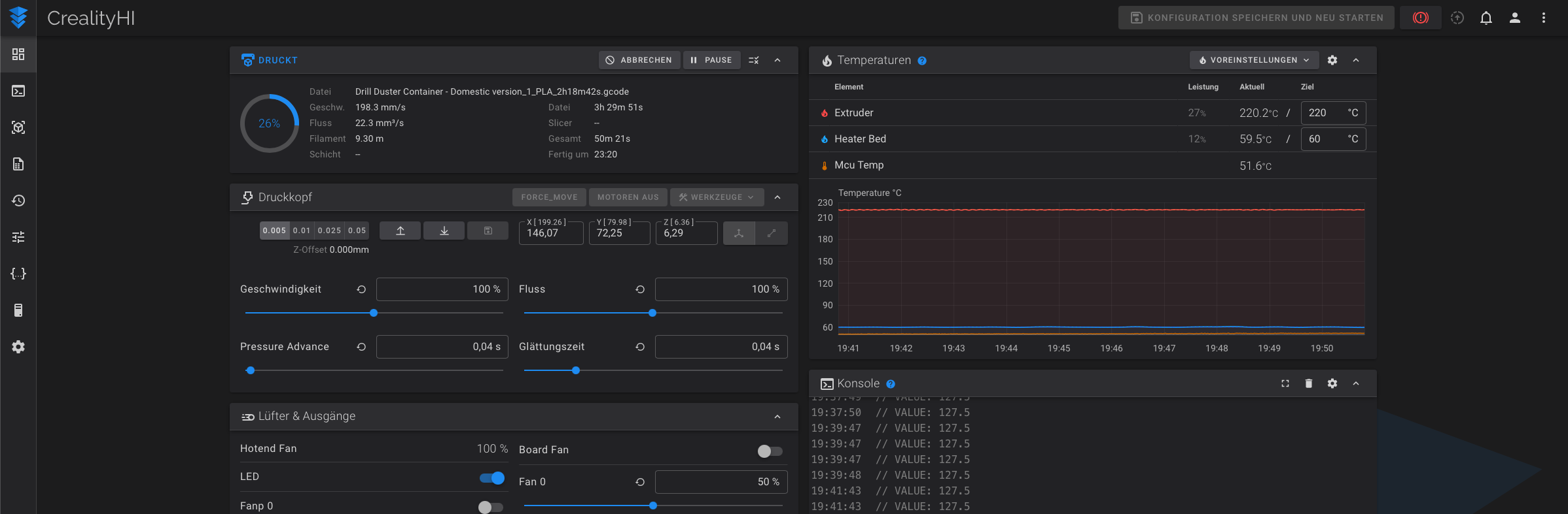 Ich hatte auch mal einen Creality Ender 3 S1 Pro mit Sonic Pad und Klipper. Deiner scheint aber auf das eigene OS von Creality zu setzen. Daher wirst du immer wieder von Moonraker und Co lesen. Die Druckerfirmware dahinter ist immer Klipper. Moonraker ist ein Webinterface, um den Drucker im Netzwerk zu steuern, genauso wie Octoprint.