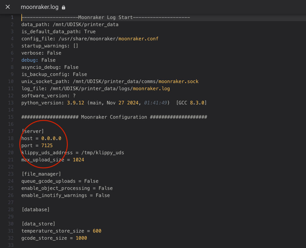 ich habe unter der IP des Druckers und dem Port 4408 direkt Zugriff auf die Fluidd Oberfläche des Druckers. Wenn ich das ganze richtig Verstanden habe sollte somit Klipper auf dem Drucker laufen. Und wenn ich dann noch in die moonraker.log schaue, sehe ich auch das Moonraker installiert ist.