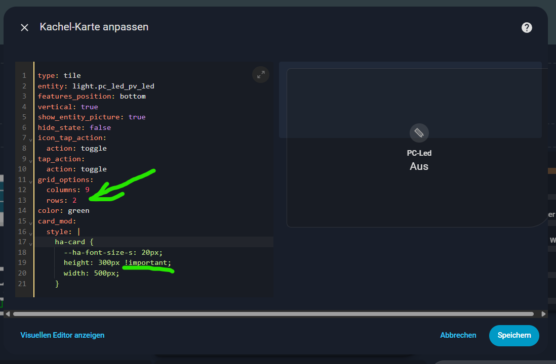 Wichtig ist hier bei height in der ha-card nach der Pixelzahl mit „!important“ zu arbeiten, ansonsten nutzt er weiterhin das css aus der Card. Important sorgt dafür, dass height in jedem Fall überschrieben wird und auch kein übergeordnetes Element mehr stören darf.