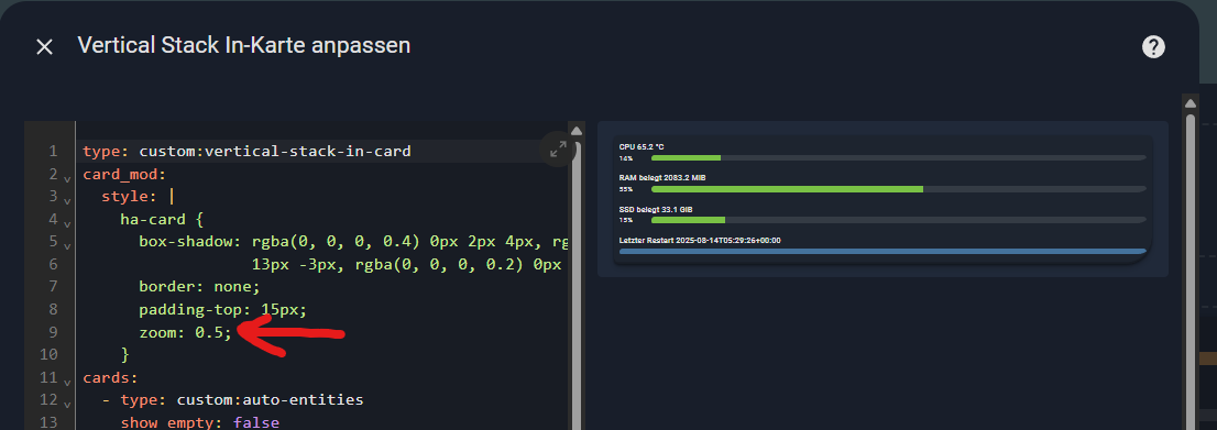 Ansonsten hättest du auch noch die Option über Card_Mod mit zoom zu arbeiten, aber dafür müsste man alle Cards anpassen bzw. den Passus mit aufnehmen. Problem ist hier auch, dass so halt auf allen Endgeräten die Cards entsprechend geschrumpft werden.