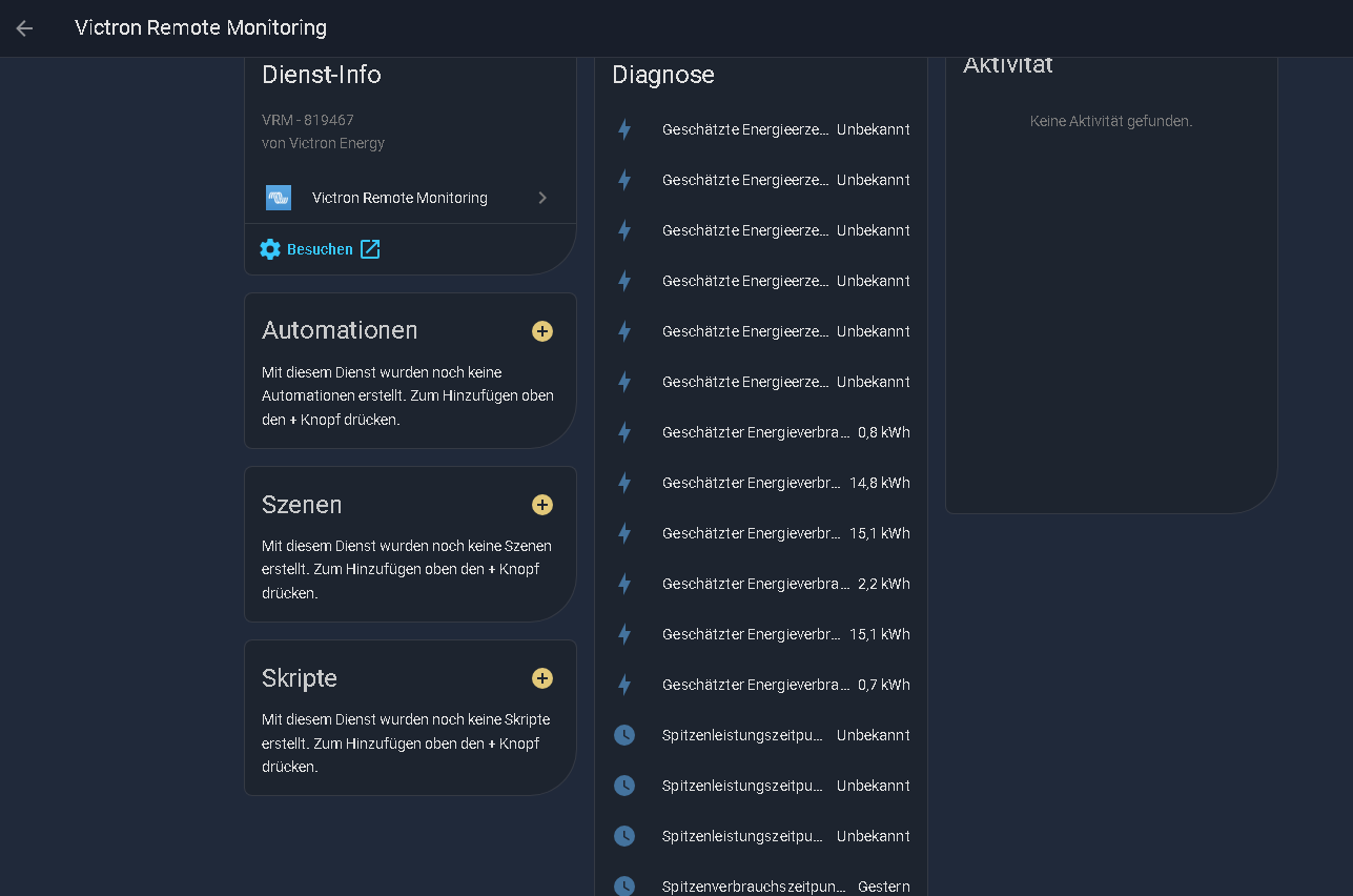 Über HA gibt es inzwischen auch eine Victron Remote Integration. Die kann direkt aus HA über Geräte und dann neue Integration hinzugefügt werden. Dazu muss aber im VRM Portal ein API Token erstellt werden. Inzwischen läuft die Integration liefert aber nicht wirklich wertvolle Daten in meinem Fall. Ich habe nur einen Multiplus 2.