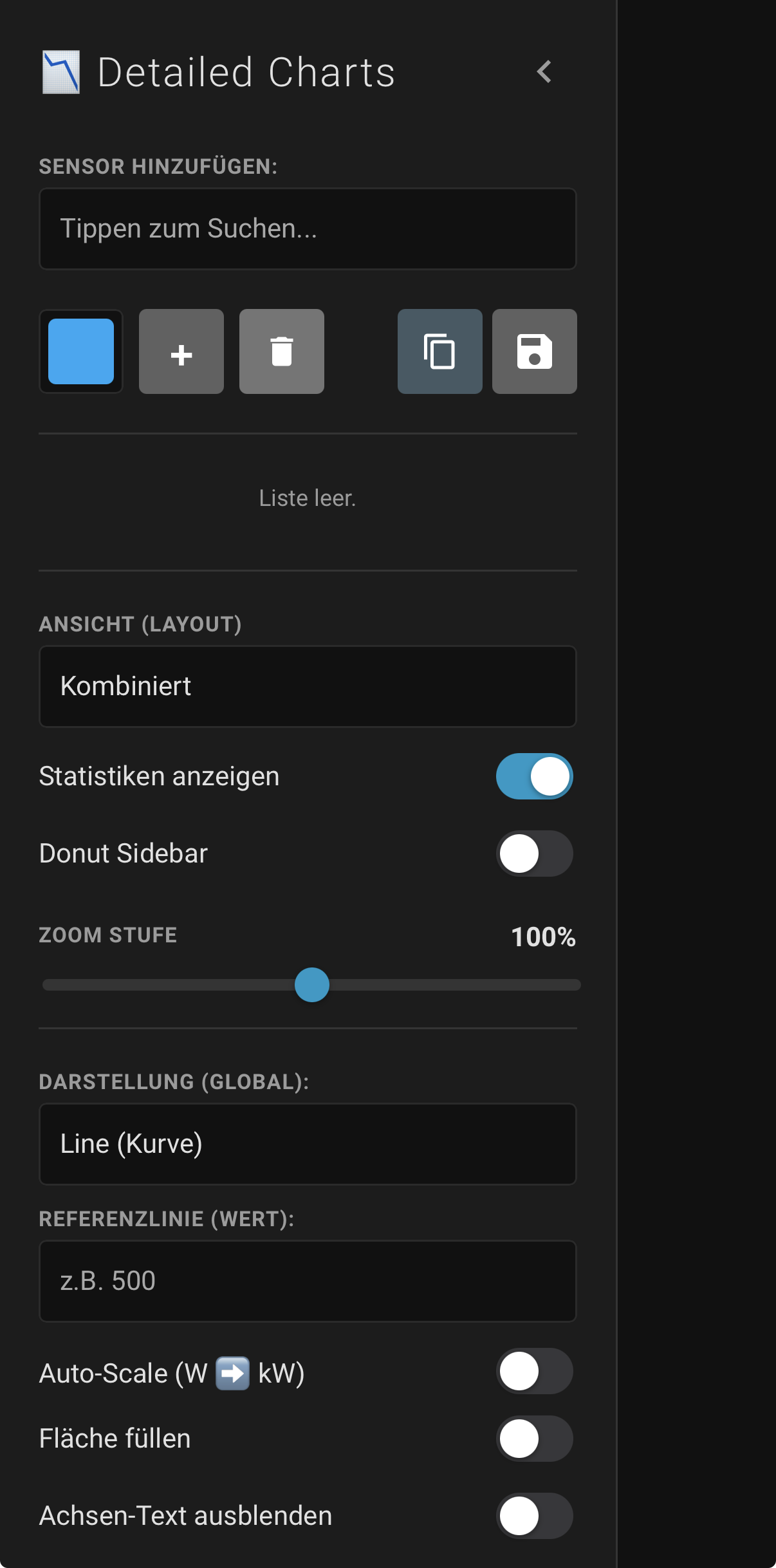 Das Panel speichert deine Einstellungen (ausgewählte Sensoren, Farben, Ansichten) automatisch im Browser (Local Storage), sodass du deine Analyseumgebung nach einem Neustart sofort wieder vorfindest. Du kannst auch mehrere Ansichten definieren und einzeln speichern. Aktuell arbeite noch an den Feinheiten für die Card auf dem Dashboard. Im Fokus steht aber das Panel!