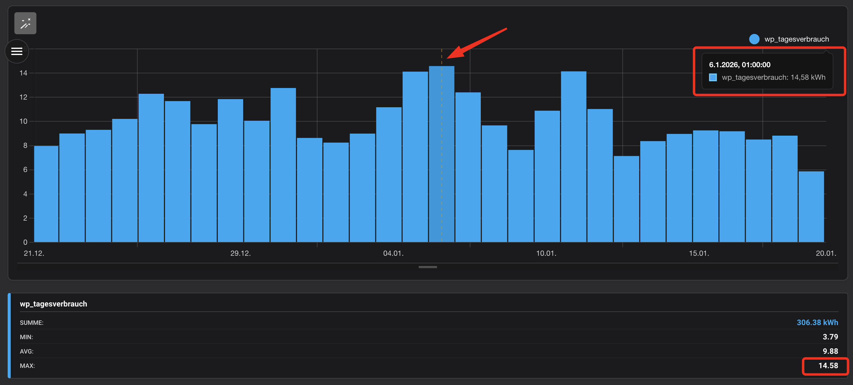 Um aufzuzeigen was ich meine, habe ich mal ein Balkendiagram des Stromverbrauchs meiner WĂ€rmepumpe der letzten 30 Tage verglichen. Einmal mit Detailed Charts Panel und dann mit Grafana. Da sind bei fast allen Tageswerten zwischen 1 und 2 kWh Abweichung. Hier mal die beiden Diagramme mit dem Tageswert vom 06.01.2026: