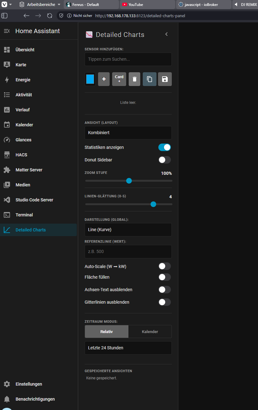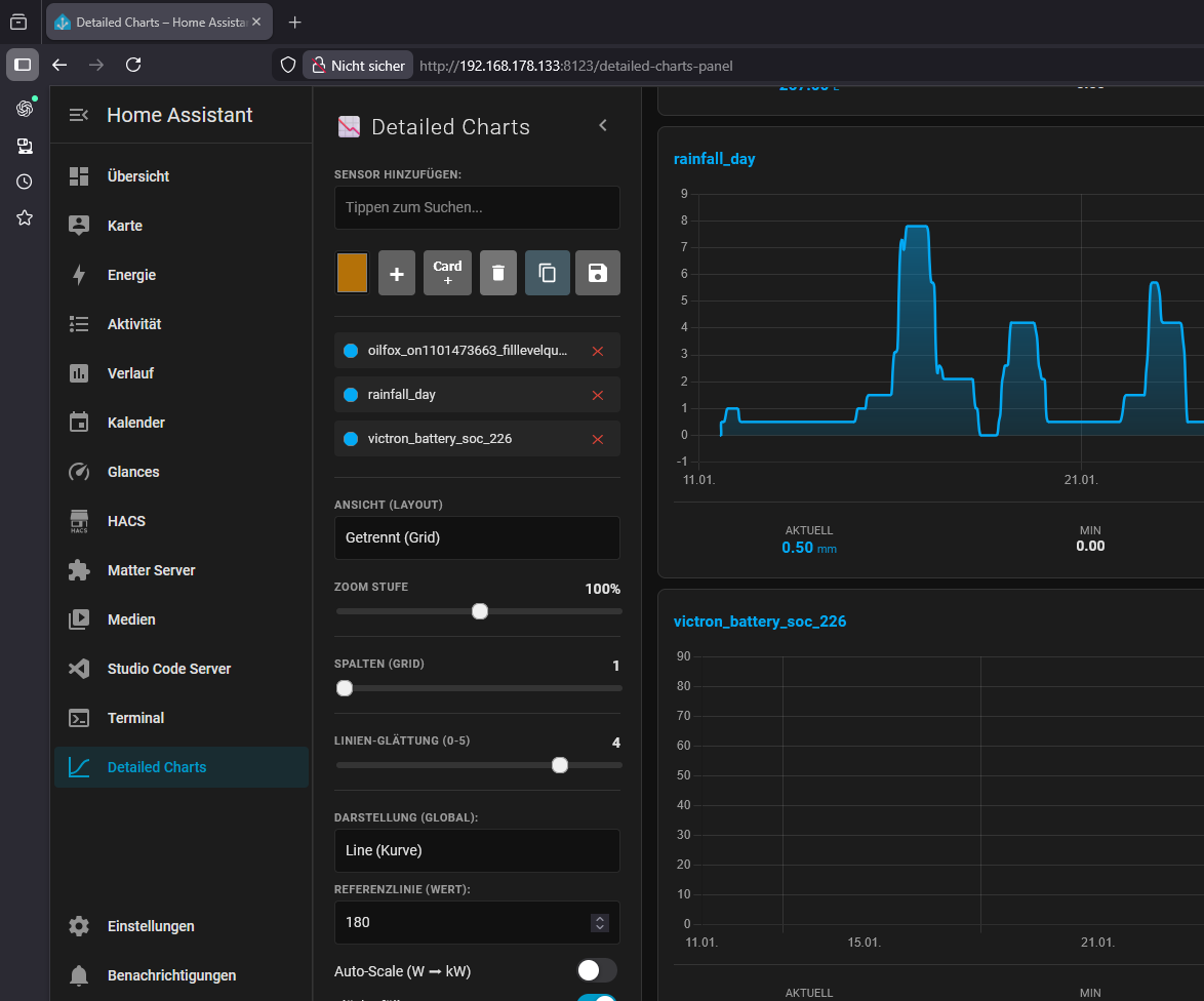 Und da ich die Grafen nie so hinbekomme wie in euren Bildern (ich habe selbst bei Windows oder Linux nur auf Dunkel gestellt) darum reichen mir auch die „HA-Default - Diagramme“, muss ich nix Einstellen nur die Entität angeben