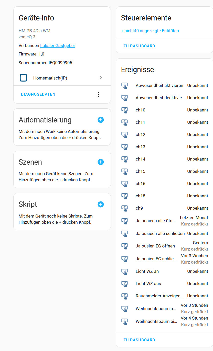 Verbindung besteht einwandfrei, denn es wird in HA gespeichert wann eine Taste gedrückt wurde.