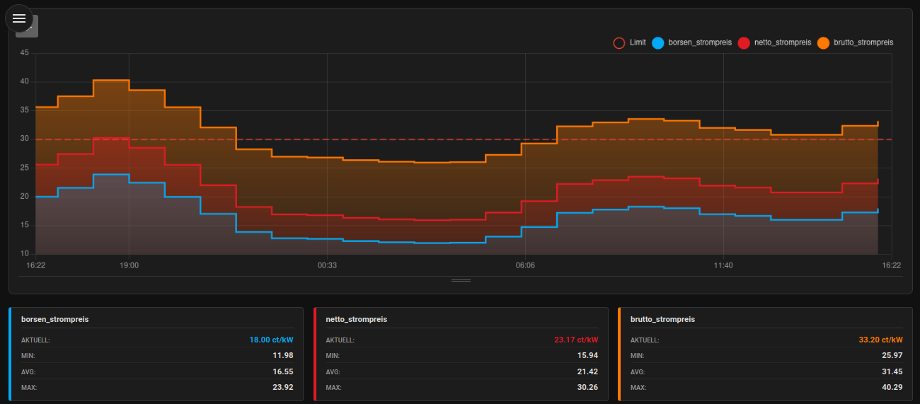 Ich nutze nur noch die ENTSO-E Abfrage über obige Integration um einen Vergleich zwischen dem dynamischen Strompreis und meinen (mittlerweile wieder) fixen Strompreis zu erhalten. So lässt sich wunderbar ausrechnen was günstiger ist.