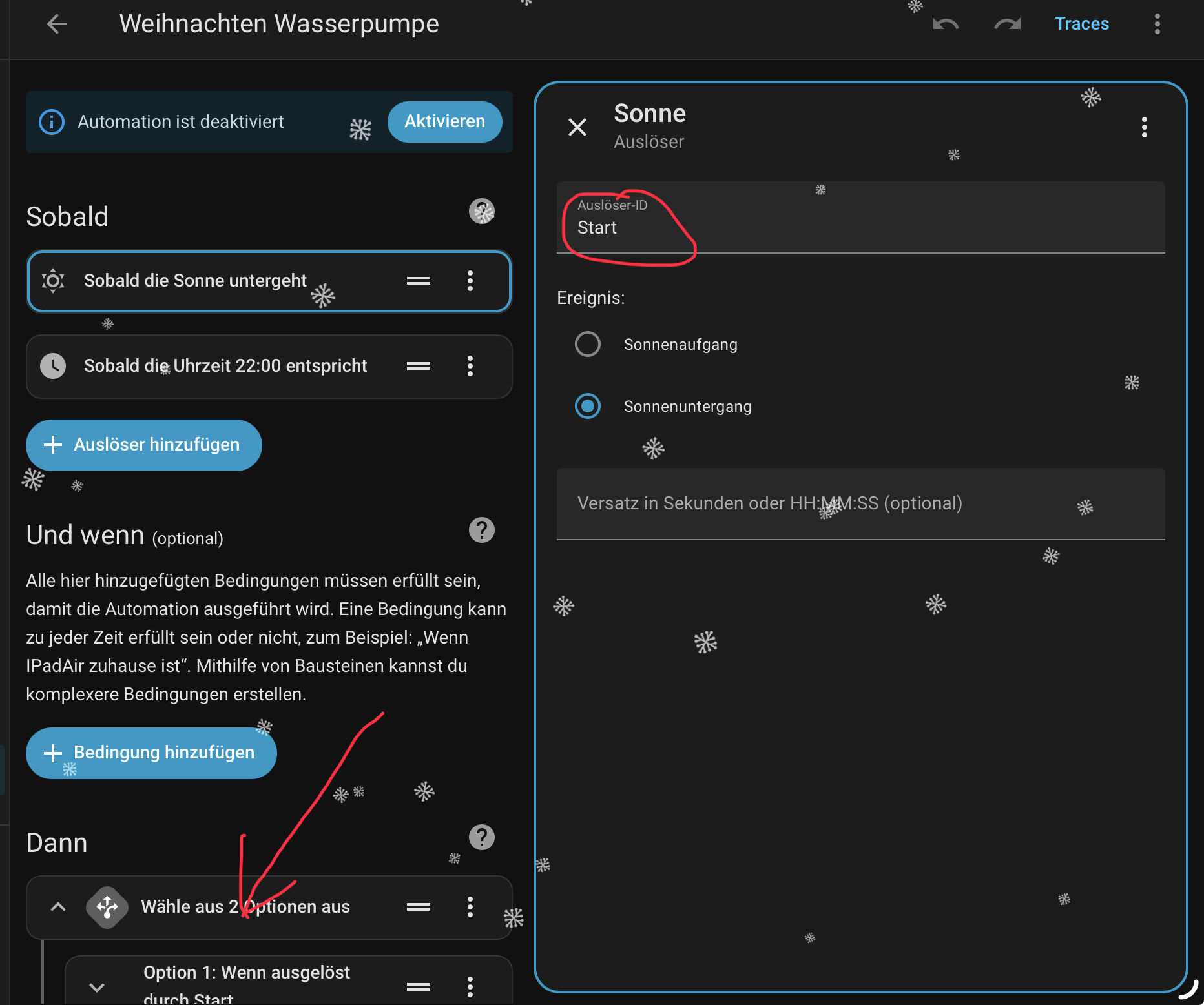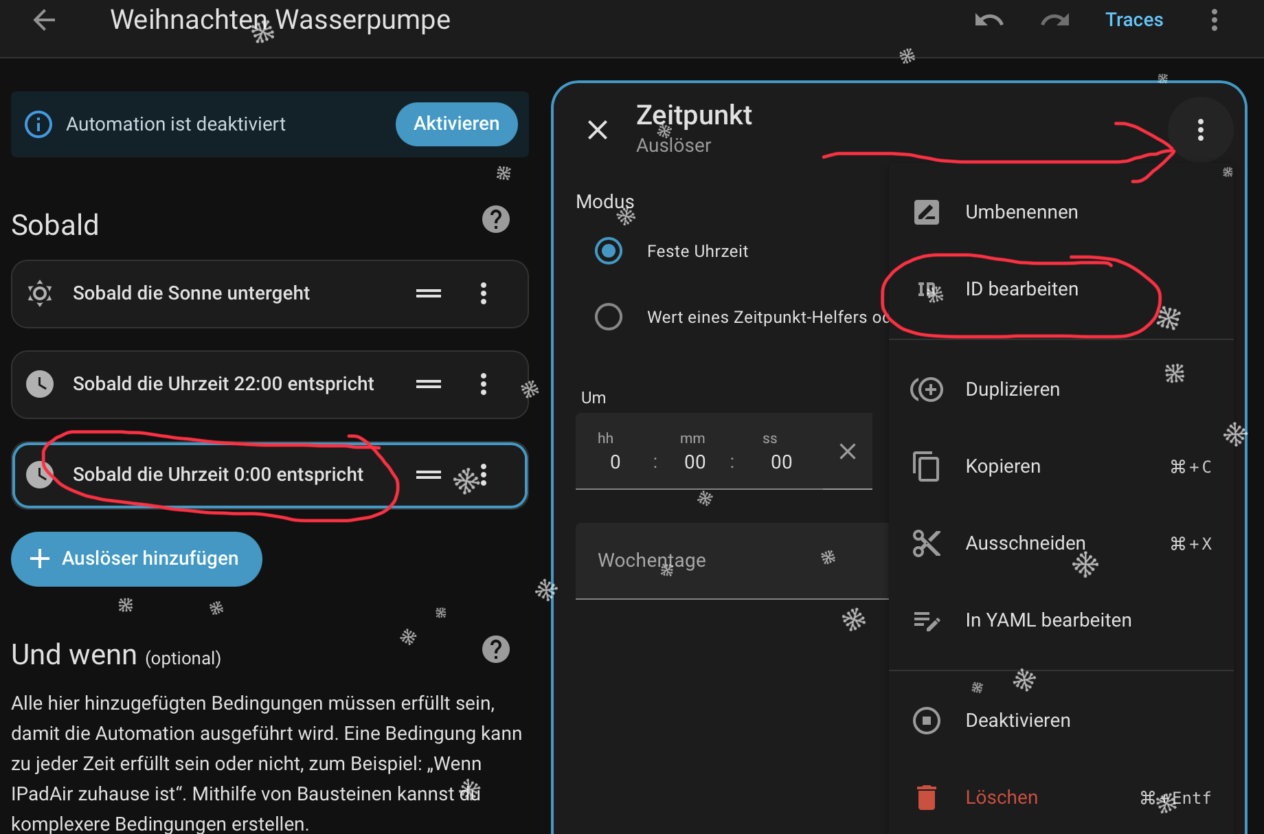 Geht aber auch einfacher, wenn du einfach eine Wiederholung baust, also z.B. alle 4h für eine halbe Stunde einschalten. Als Bedingung setzt du dann die Uhrzeit zwischen 06:00 und 22:00 Uhr, dann wird nur in dieser Zeit der Trigger ausgeführt.