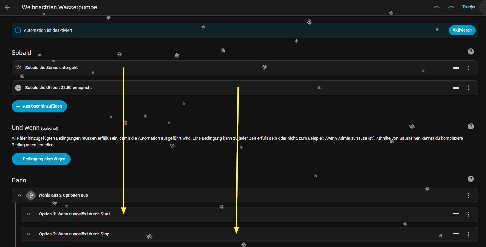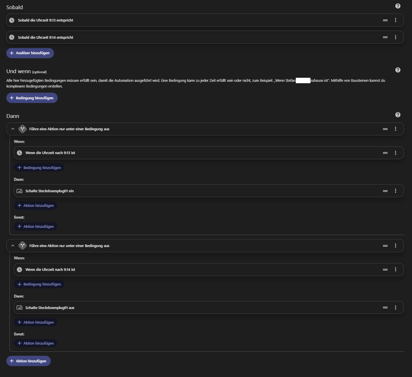 Danke… aber bitte nur als „Wenn - Dann“ ich kann kein Yaml. habe es erst mal auf die „schnelle“ mit einzelnen „An und Aus“ realisiert, stört auch nicht weil einmal Eingerichte schaue ich da eh nie mehr rein.