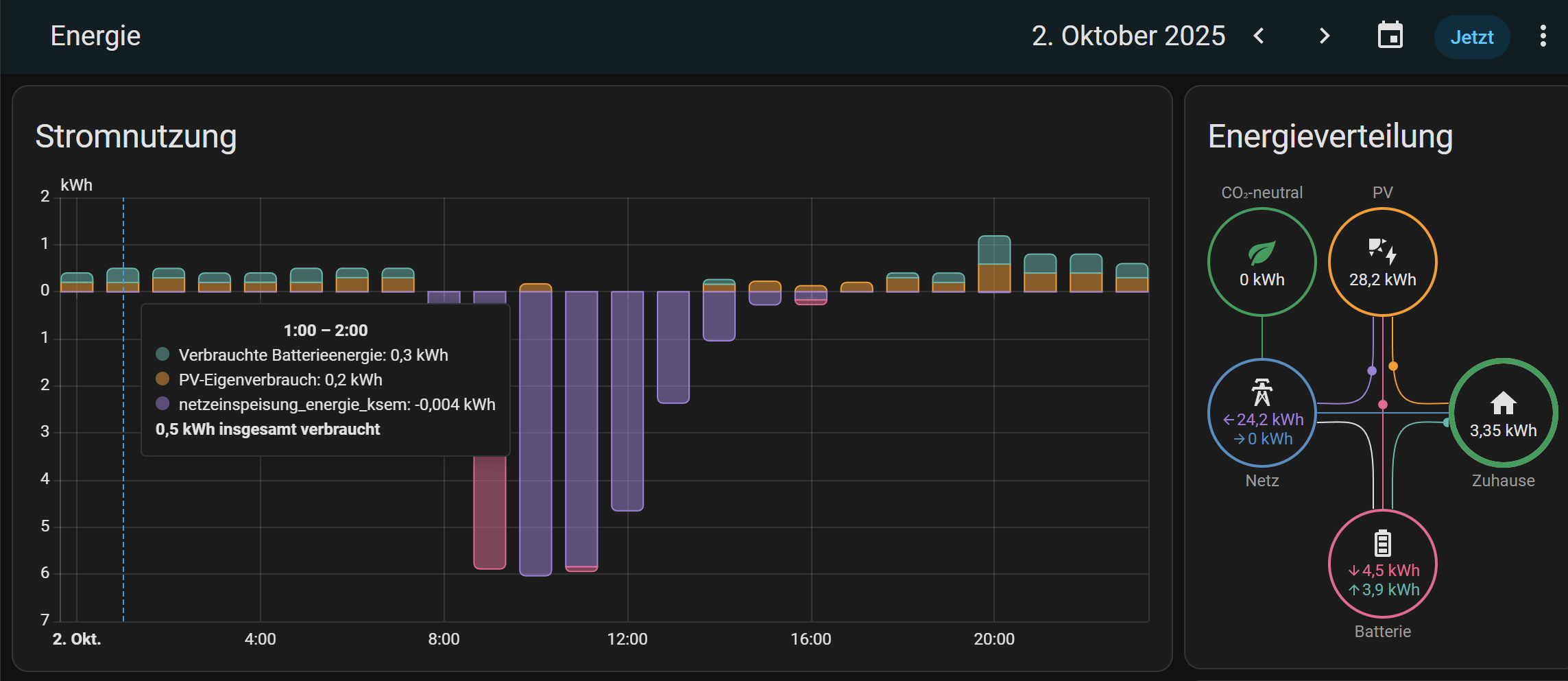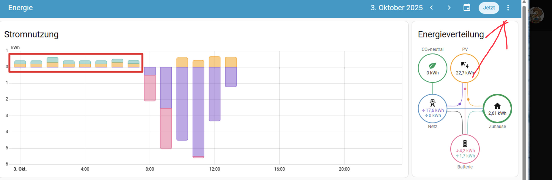 Die rot umrandeten Werte zeigen in gelb „PV-Eigenbedarf“. Das ist keine Entität, die ich in meinem HA finden kann. Und vor allem scheint auch hier leider nachts nicht die Sonne. Daher die Frage, wo definiert ist, wie diese Werte ermittelt werden bzw. wie/wo das konfiguriert werden kann.