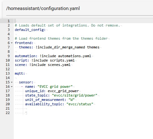 Moin, dir fehlen noch ein paar Dinge um Daten von evcc in HA zu erhalten. Du brauchst bei evcc einen mqtt Broker (mosquitto broker) in HA, um die Daten von evcc zubekommen. Das sind zwei getrennte System und über den Broker stellst du sozusagen die Verbindung zwischen beiden System her. Erst wenn die Schritte erledigt sind, kannst du in der configuration.yaml Sensoren definieren, die dann auch Daten erhalten.