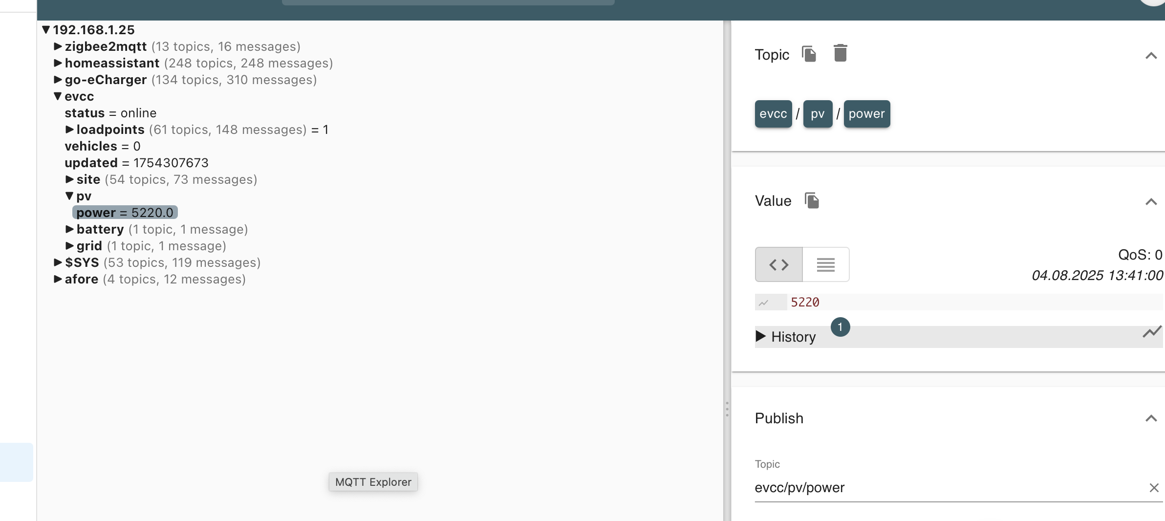 Hallo und sry wenn ich nochmals lästig bin. Ich glaub dass ich schon einen Schritt weiter bin. Eine Verbindung evcc zu mqtt steht bereits und im MQTT Explorer sehe ich auch schon Einträge - siehe wie folgt: