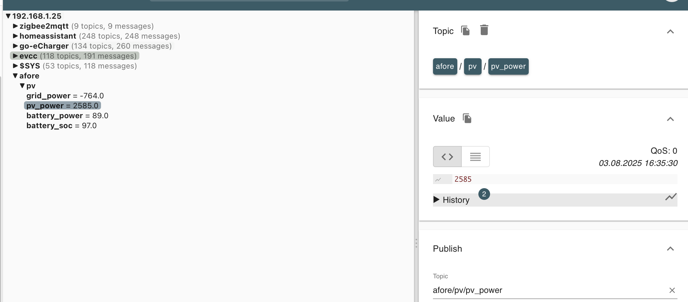 sry evtl. habe ich mich in den oben angeführten Posts unklar ausgedrückt. In Home Assistent habe ich mittels Solarman meinen Afore implementiert - sprich ich sehen da die einzelnen Entitäten meines Wechselrichters. Ich möchte nun diese Daten an EVCC übermitteln - und das wollte ich mit MQTT realisieren…
