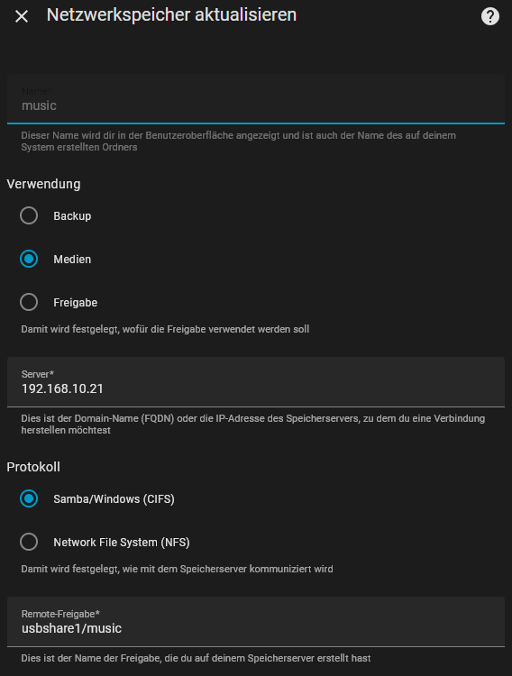 Dann habe ich noch weitergesucht und mir alle Einstellungen und Eigenschaften des usbshare angeschaut und mit denen in HA verglichen. Bis mir dann aufgefallen ist, das als Pfad auf der NAS „/volumeUSB1/usbshare“ angegeben ist, meine Einstellung in HA war aber „usbshare1/music“.