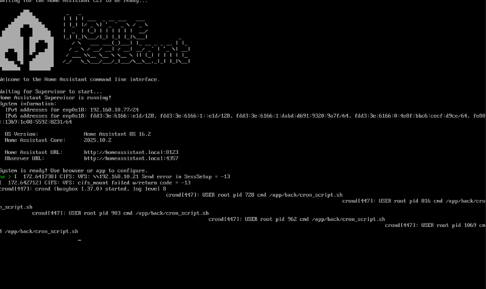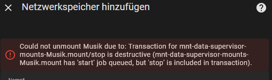 Also nochmal alles in HA Schritt für Schritt durchgegangen, dann bin ich auf Music Assistant gestossen wo unter Einstellungen/ Music-Anbieter Hinzufügen ein Eintrag mit Filesystem (remote share) Eingetragen war. Ist natürlich, wie kann es auch anders sein ein SMB-Share. Also auch gelöscht, HA runtergefahren, Neu gestartet… Hurraaaa, der cifs Fehler ist weg.
