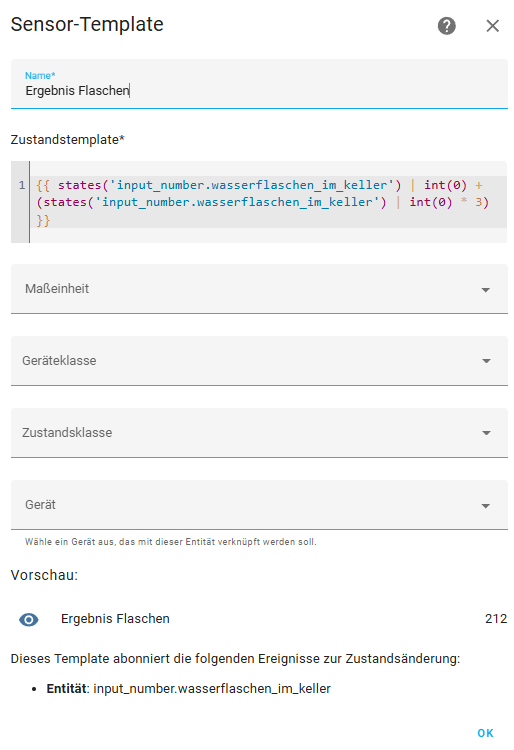 Sobald ich neues Wasser gekauft habe soll betätige ich im Keller ein Schalter. Dann wird geprüft wieviel Wasser aktuell im Keller ist und dann werden die gekauften Flaschen drauf gerechnet. Ich kaufe immer 3 neue Kisten wenn 3 Kisten leer sind. Habe mit Hilfe von ChatGPT alles so eingestellt aber immer wenn ich dem Template die Formel eingeben möchte und ich es danach Speicher kommt danach die Meldung: [Object Object] null