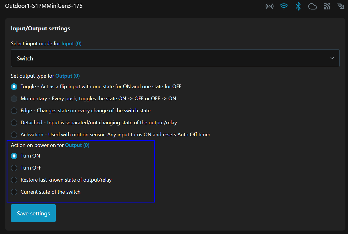 Was ist eingestellt bei Neustart des Shelly? Zufällig On