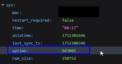 {„ble“:{},„bthome“:{„errors“:[„bluetooth_disabled“]},„cloud“:{„connected“:true},„input:0“:{„id“:0,„state“:null},„knx“:{},„matter“:{„num_fabrics“:0,„commissionable“:true},„modbus“:{},„mqtt“:{„connected“:false},„switch:0“:{„id“:0, „source“:„timer“, „output“:false,„temperature“:{„tC“:43.8, „tF“:110.8}},„sys“:{„mac“:„A085E3BD7E68“,„restart_required“:false,„time“:„10:08“,„unixtime“:1752307711,„last_sync_ts“:1752307325,„uptime“:390,„ram_size“:344824,„ram_free“:175320,„ram_min_free“:162140,„fs_size“:917504,„fs_free“:450560,„cfg_rev“:15,„kvs_rev“:0,„schedule_rev“:0,„webhook_rev“:0,„btrelay_rev“:0,„bthc_rev“:0,„available_updates“:{„stable“:{„version“:„1.6.2“}},„alt“:{„S1G4ZB“:{„name“:„1 Gen4 with Zigbee“,„beta“:{„version“:„1.7.0-beta3“,„build_id“:„20250711-125403/1.7.0-beta3-g5c779c4“},„stable“:{„version“:„1.6.2“,„build_id“:„20250520-083719/1.6.2-gc8a76e2“}}},„reset_reason“:3,„utc_offset“:7200},„wifi“:{„sta_ip“:„192.168…..status“:„got ip“,„ssid“:"….,„ws“:{„connected“:false}}