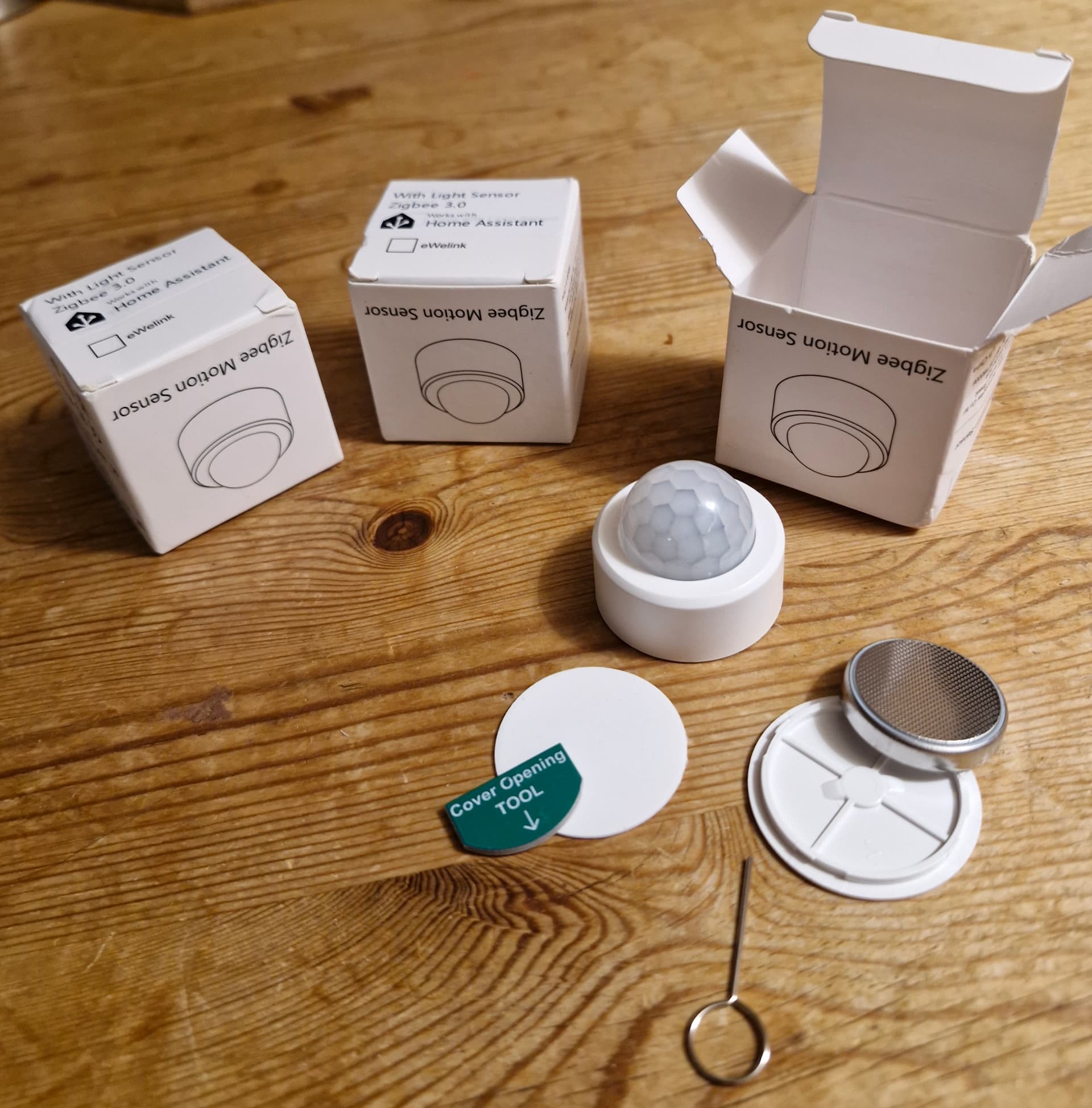 Die machen im Zigbee-Mesh eine guten Job, haben ein hohe Erkennungs-Reichweite, 'ne fette 2450er-Batterie, ein Teach-Dorn, ein Batteriedeckel-Werkzeug, ein Klebe-Pad und . . . . ein Home Assistant Label.