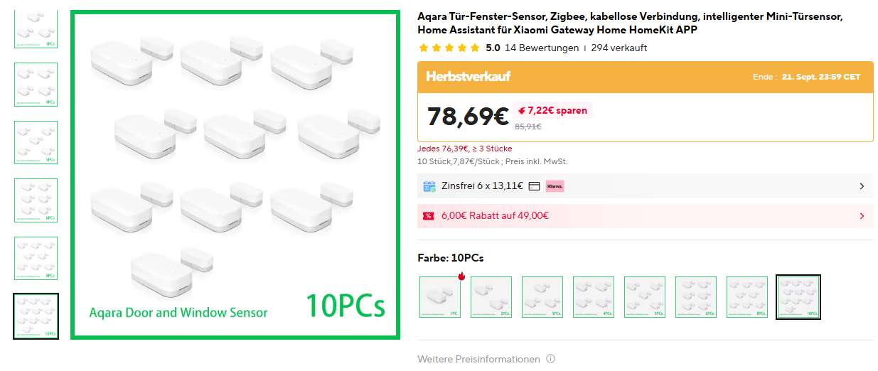 10 Stück >> Aqara-Fenstersensoren << 7,17 € / Stück.