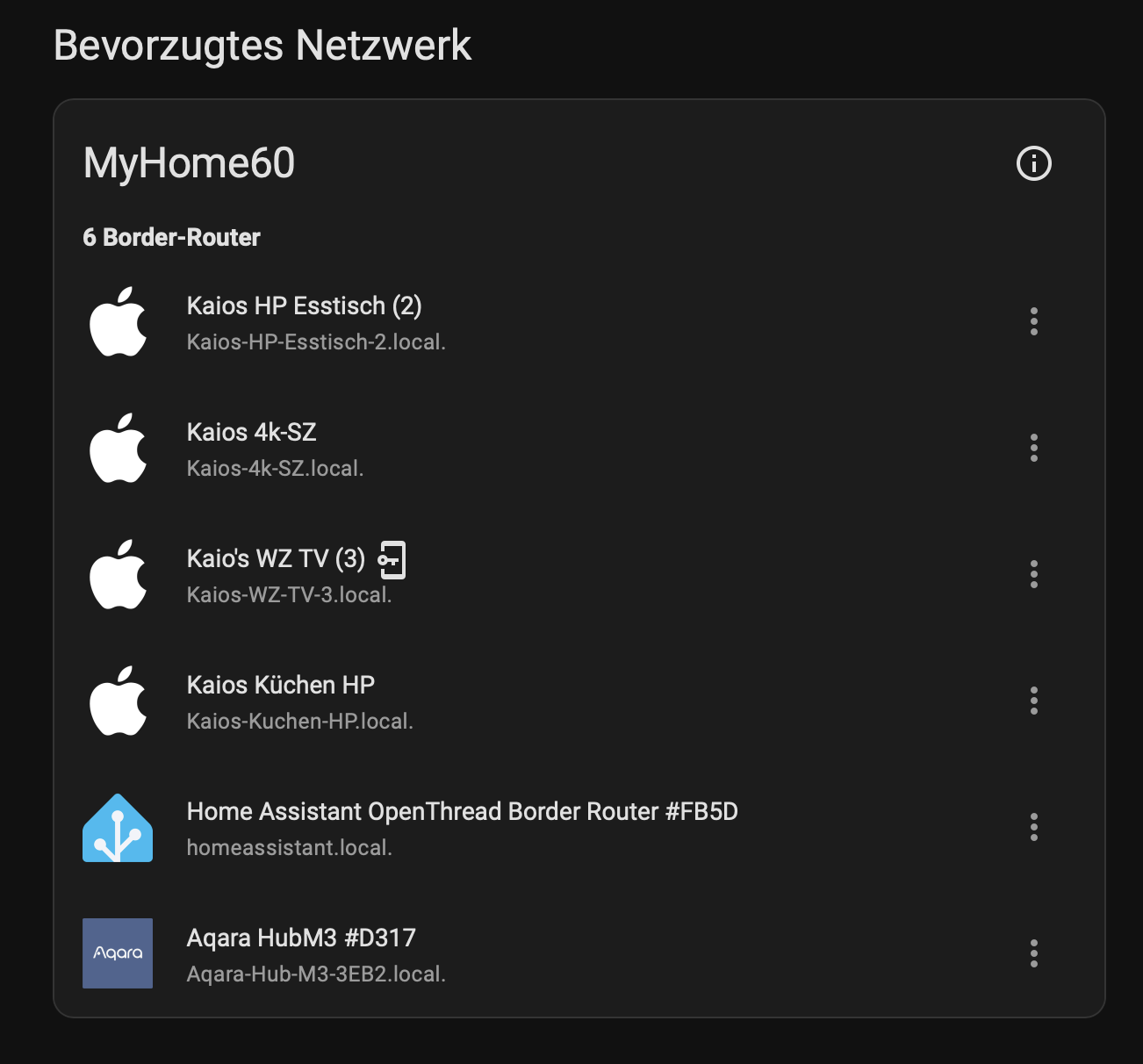 Thread ist unter dem OpenThread Border Router eingerichtet. Im Thread “Reiter” unter den “Geräten und Diensten” (Seit dem neuen HA Update findet man diesen auch direkt unter den Einstellungen) wird der Thread Border Router erkannt. Dort steht von oben nach unten: “ha-thread-fa7c”. Dann “1 Border Router” und darunter “Home Assistant OpenThread Border Router #9E15”. Darunter steht “Homeassistant.local”.
