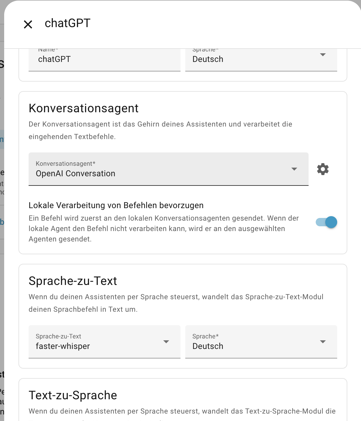 Anwender per Text oder Sprache (Sprache über Wyoming Protokoll und Whisper) STT zu LLM (z.B. mittels „OpenAI“ Integration) und die KI Antwort wiederum zurück über (Wyoming Protokoll und Piper) TTS zum Anwender.