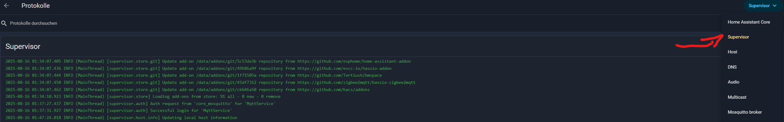 Moin, die Logmeldungen zeigen leider nicht den Fehler, nur den Eintrag das der Supervisor neugestartet wurde. In diesem Zuge ist der Websocket natürlich auch kurz nicht erreichbar, weil HA neu gestartet wurde. Der Fehler müsste also etwas unter diesen beiden Einträgen im Log zu finden sein.