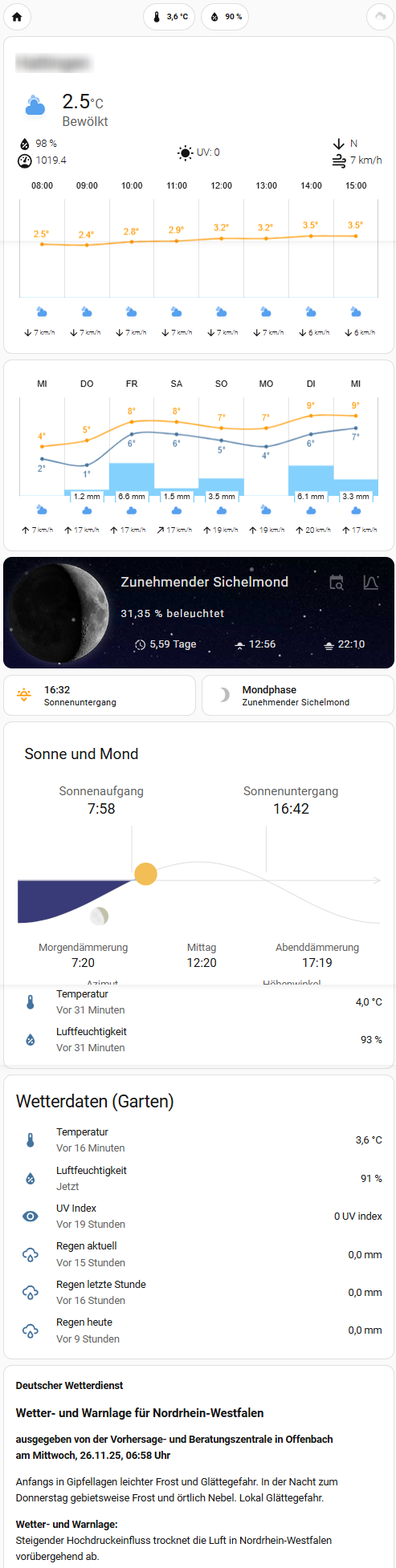 Eine Wetterberichtkarte findest du auch bei mir. Hier mal vereinfacht in eine Markdown-Card gepackt. Die Entität für den Wettersensor musst du an deinen dwd sensor anpassen.