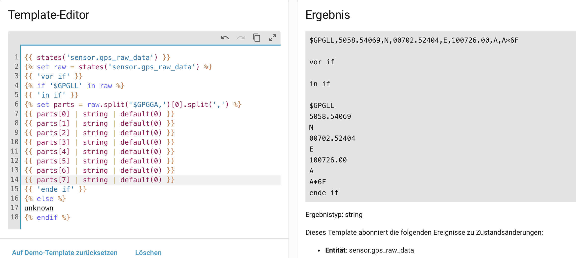 Wichtig ist daher im Template die Auswertung der Rohdaten vom Sensor und über part kann die gewünschte Nummer abgegriffen werden. Ich denke mal du möchtest nachher einen Standort haben, also brauchst du Breiten- und Längengrad mit Ausrichtung (N-S oder W-O) Anzahl der Satelliten ist immer interessant zu wissen und zum Schluss noch die gewünschte Höhe.