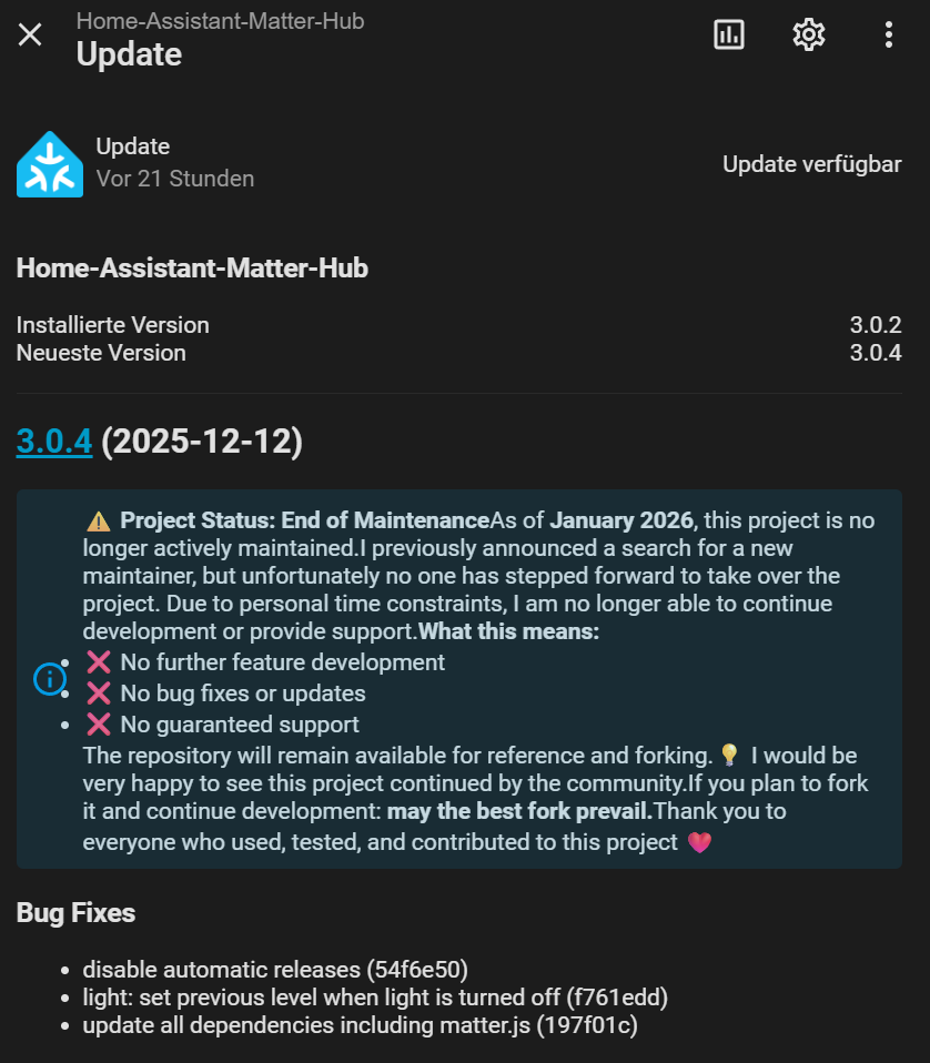 Der Home-Assistant-Matter-Hub wird evtl. in Zukunft nicht mehr funktionieren.
