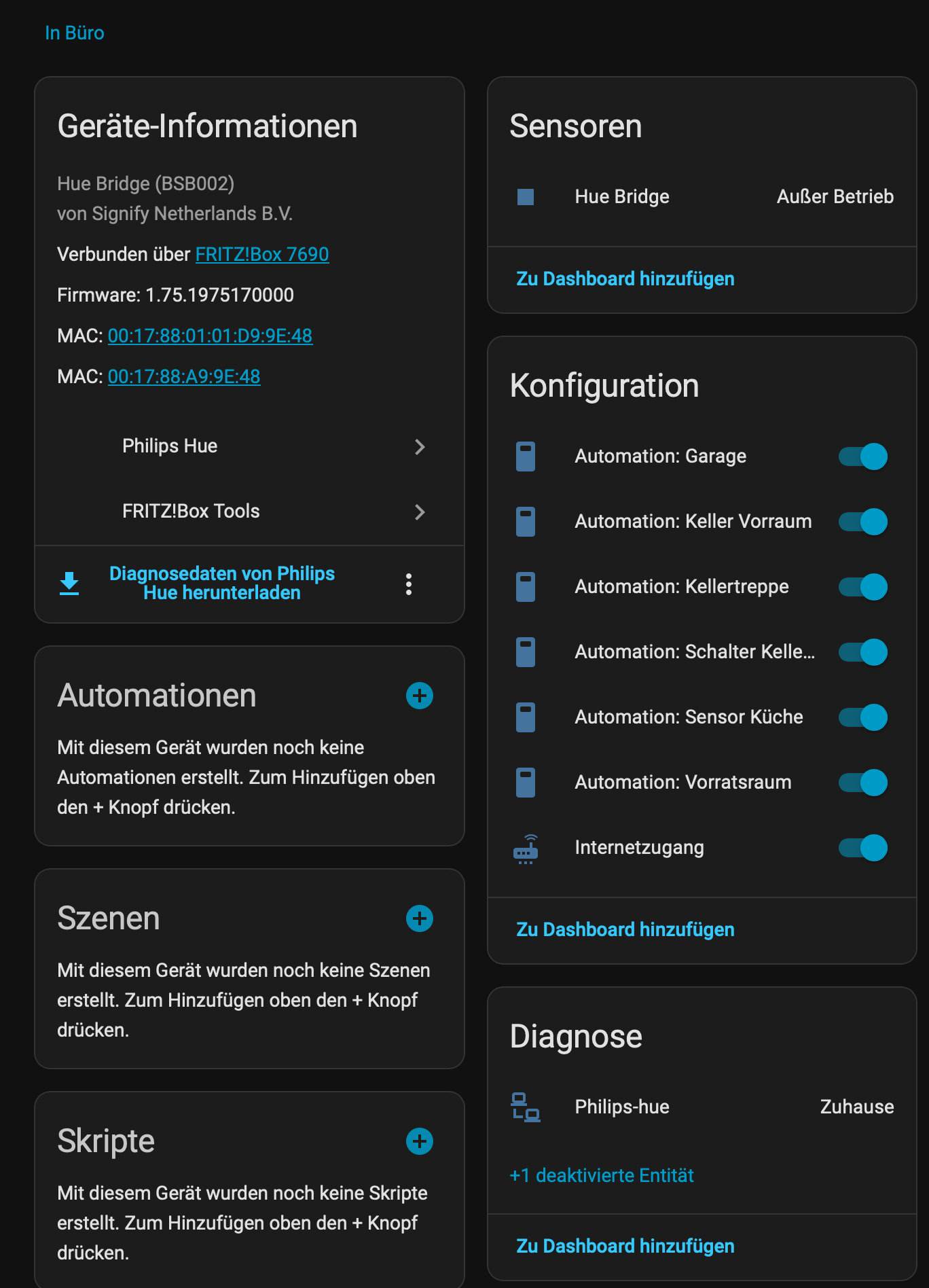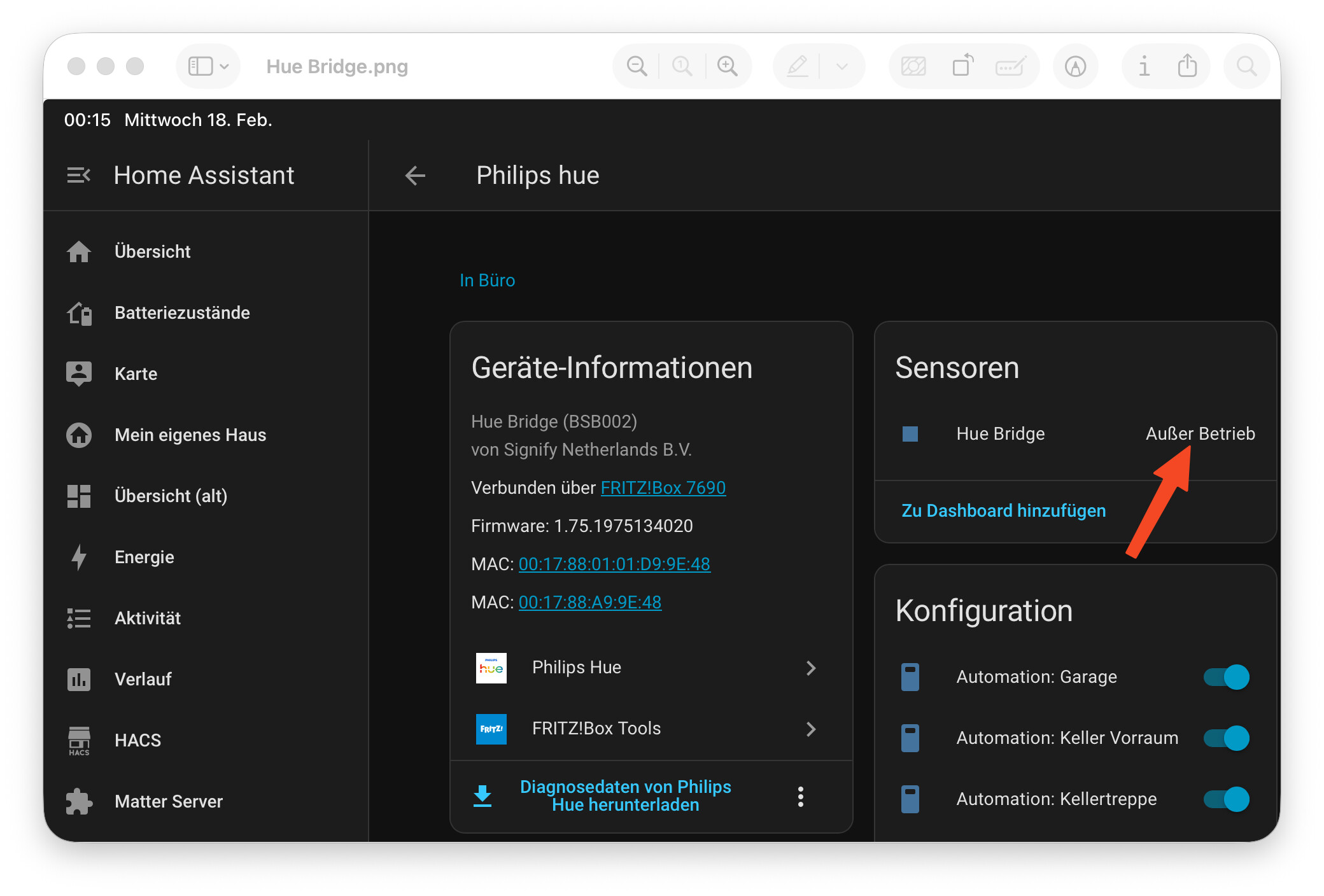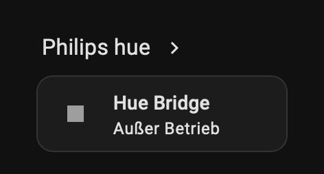 Ich habe eine Hue Bridge eingebunden, alle Entitäten funktionieren. Die Bridge selbst wird immer als „Außer Betrieb“ angezeigt. Warum?