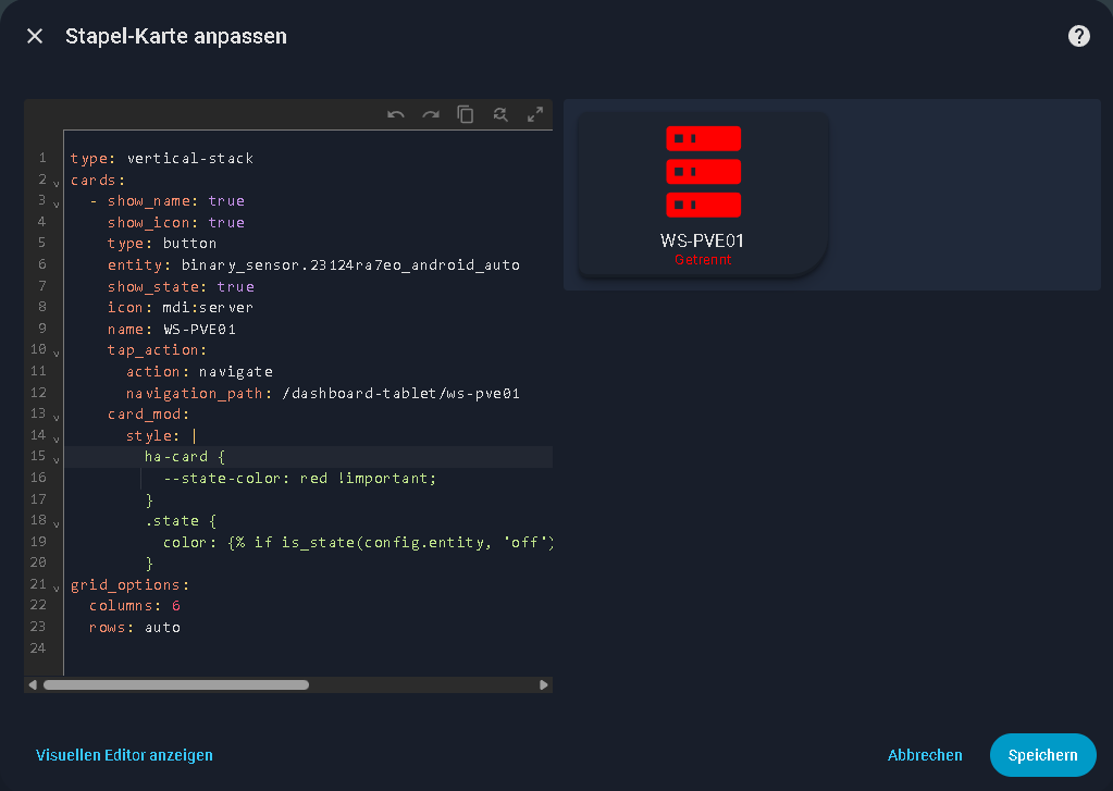 Ah ok, dann muss man das über eine Sensorabfrage im Template machen, dann kannst du den anderen Sensor abfragen und beliebig einfärben. Habe dir jetzt alle drei Werte gesetzt für Icon, Name und Secondary. Ich gehe davon aus, dass dein Sensor on/off liefert. Wenn nicht, muss das im Template neben der Farbe auch anpassen.