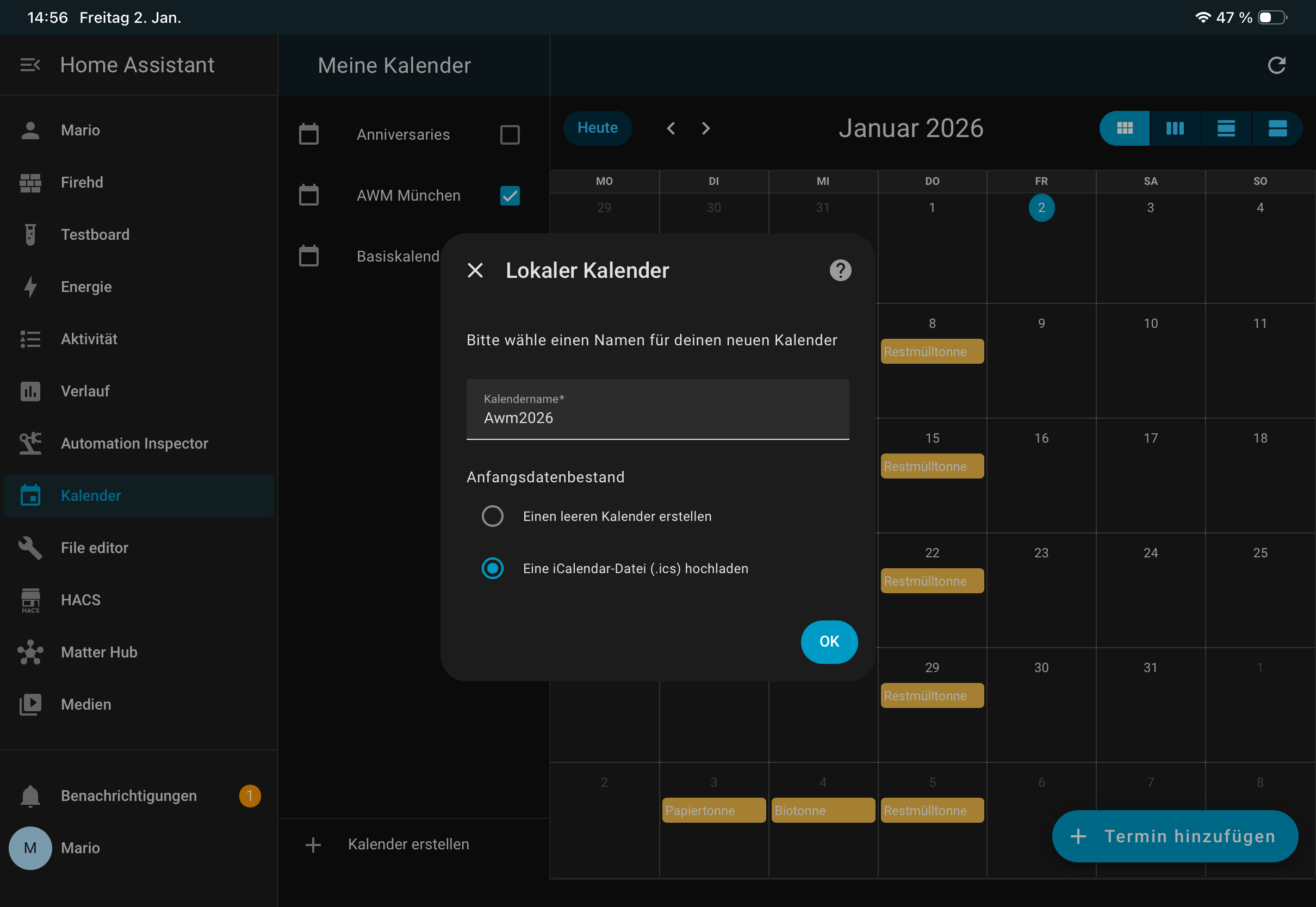Ich versuche unter Kalender mit dem + einen neuen Kalender mit dem Import einer ics Datei zu erstellen. Wenn ich dann die Datei auswähle wird diese auch angezeigt. Wenn ich dann mit ok bestätige, kommt die Fehlermeldung. Mit der trashcard-Karte wird dann auf den Kalender zugegriffen.
