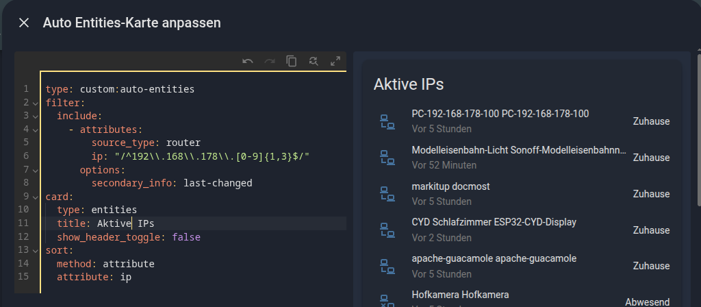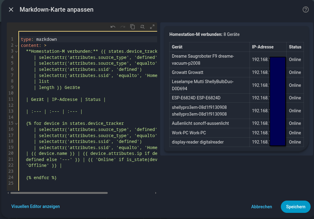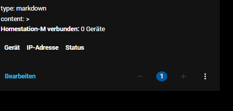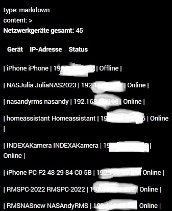 Ich habe mir in der Systemübersicht auch eine Anzeige für die aktiven IP Adressen, allerdings für mein WLAN Netz. Dafür nutze ich eine Markdown-Card um eine Tabelle mit den IPs darzustellen.