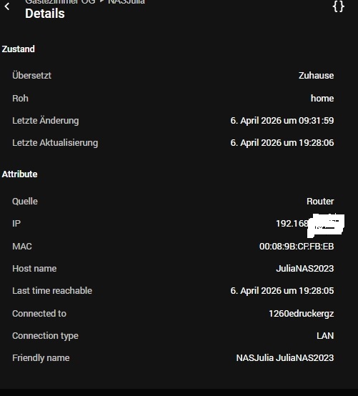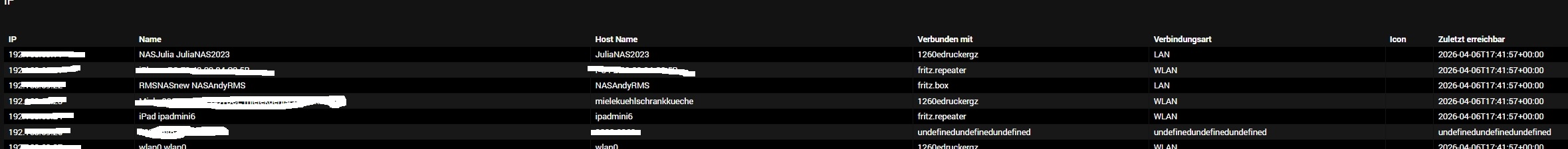 Quelle / IP / Host Name / Last time reachable / Connected to / Connection Type / SSID / Friendly name