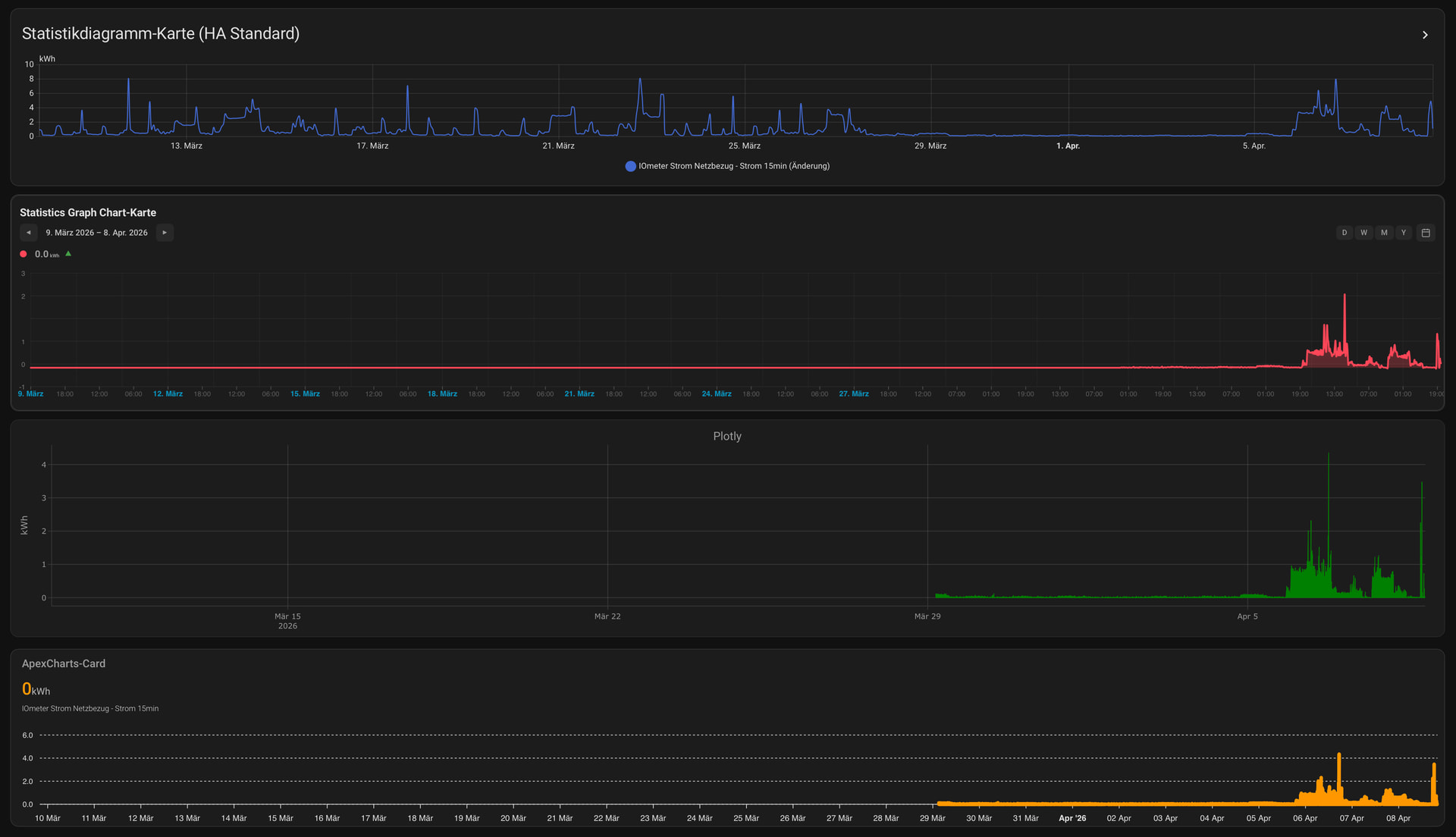 irgendwie fehlen in Hacs Karten die Langzeitstatistiken. Ich habe mal zu Spaß einen Vergleich gemacht. Alle 4 mit der gleichen Entität, nur das Statistikdiagramm zeigt Werte nach dem 10. Tag. Obwohl ich entsprechende Zeiträume ausgewählt habe.