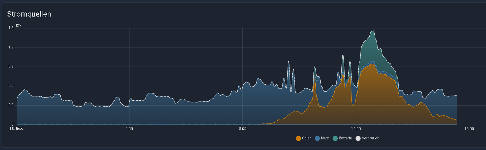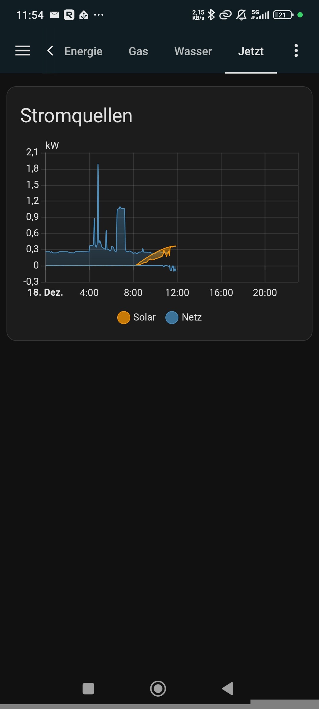Gute Frage. Manchmal wird sie angezeigt, manchmal nicht. Bis auf die fehlende Linie sieht es aktuell auch wieder Normal aus, nur morgen wird es am Anfang wieder aussehen wie heute morgen. Ich beobachte das schon ein paar Tage. Es spielt auch keine Rolle ob ich einen oder mehrere Wechselrichter einbinden. Ich habe auch alle Datenquellen erneut eingegeben. Was mich wundert ist die runde Form der zweiten Linie!?