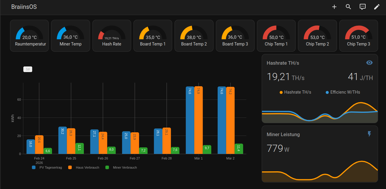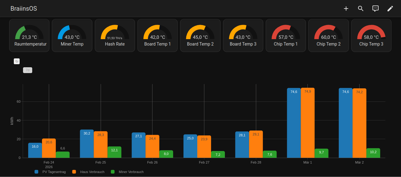 Im oberen Bereich werden die verschiedenen Temperaturen angezeigt und unter in der Bar Card die PV Tageserzeugung, den Hausverbrauch und der Verbrauch was der Miner ĂĽber den Tag so hat.