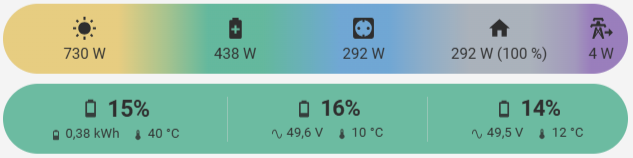 Inspiriert von der aktuellen Diskussion bzgl. der PowerFlow Karten, habe ich meine eigene Karte erstellt und gerade veröffentlicht (Github). Ich freue mich über jedes Feedback! Ziel war, eine minimalistische Karte zu bauen, die den Energiefluss und den Anteil der einzelnen Sektoren anzeigt und dabei vollkommen dynamisch ist. Ich bin ein Freund von klarem Design und habe die Karte so gestaltet, dass nur das angezeigt wird, was auch verfügbar ist. Wer auf wenig Raum viele Informationen schnell und intuitiv erfassen möchte, kann sich die Karte gerne ansehen.